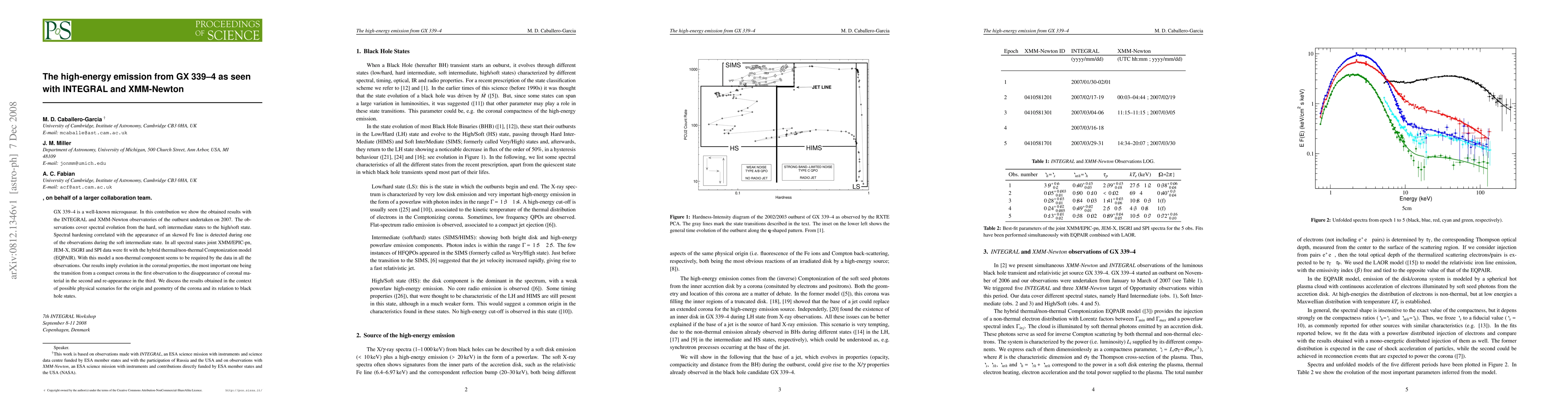 GX 339--4 is a well-known microquasar. In this contribution we show the obtained results with the INTEGRAL and XMM-Newton observatories of the outburst undertaken on 2007. The observations cover spectral evolution from the hard, soft intermediate states to the high/soft state. Spectral hardening correlated with the appearance of an skewed Fe line is detected during one of the observations during the soft intermediate state. In all spectral states joint XMM/EPIC-pn, JEM-X, ISGRI and SPI data were fit with the hybrid thermal/non-thermal Comptonization model (EQPAIR). With this model a non-thermal component seems to be required by the data in all the observations. Our results imply evolution in the coronal properties, the most important one being the transition from a compact corona in the first observation to the disappearance of coronal material in the second and re-appearance in the third. We discuss the results obtained in the context of possible physical scenarios for the origin and geometry of the corona and its relation to black hole states.