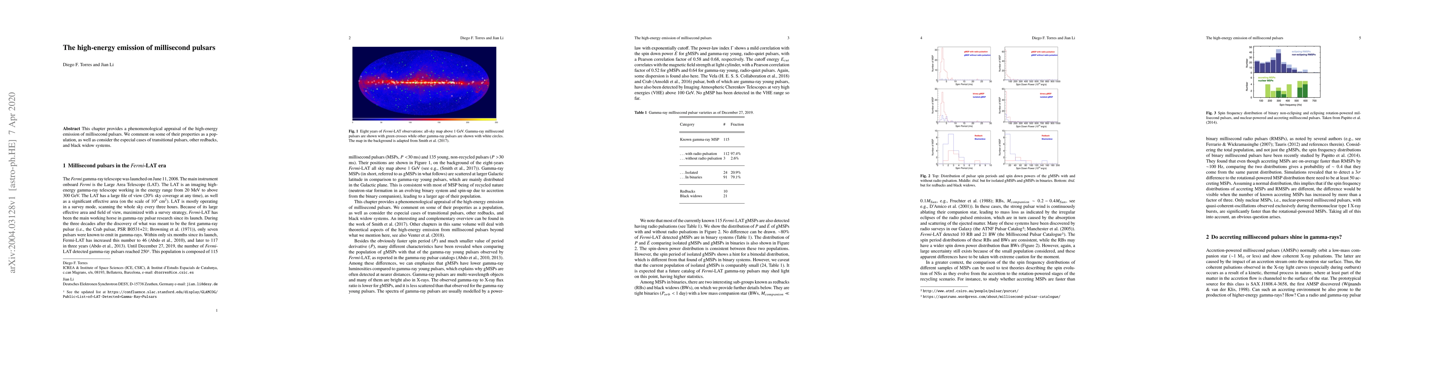 This chapter provides a phenomenological appraisal of the high-energy emission of millisecond pulsars. We comment on some of their properties as a population, as well as consider the especial cases of transitional pulsars, other redbacks, and black widow systems.