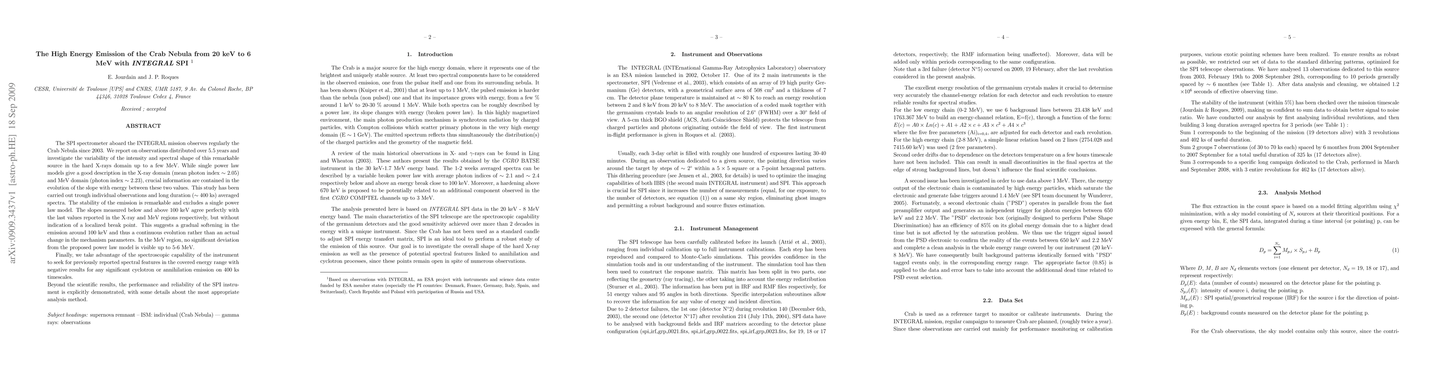 The SPI spectrometer aboard the INTEGRAL mission observes regularly the Crab Nebula since 2003. We report on observations distributed over 5.5 years and investigate the variability of the intensity and spectral shape of this remarkable source in the hard X-rays domain up to a few MeV. While single power law models give a good description in the X-ray domain (mean photon index ~ 2.05) and MeV domain (photon index ~ 2.23), crucial information are contained in the evolution of the slope with energy between these two values. This study has been carried out trough individual observations and long duration (~ 400 ks) averaged spectra. The stability of the emission is remarkable and excludes a single power law model. The slopes measured below and above 100 keV agree perfectly with the last values reported in the X-ray and MeV regions respectively, but without indication of a localized break point. This suggests a gradual softening in the emission around 100 keV and thus a continuous evolution rather than an actual change in the mechanism parameters. In the MeV region, no significant deviation from the proposed power law model is visible up to 5-6 MeV. Finally, we take advantage of the spectroscopic capability of the instrument to seek for previously reported spectral features in the covered energy range with negative results for any significant cyclotron or annihilation emission on 400 ks timescales. Beyond the scientific results, the performance and reliability of the SPI instrument is explicitly demonstrated, with some details about the most appropriate analysis method.