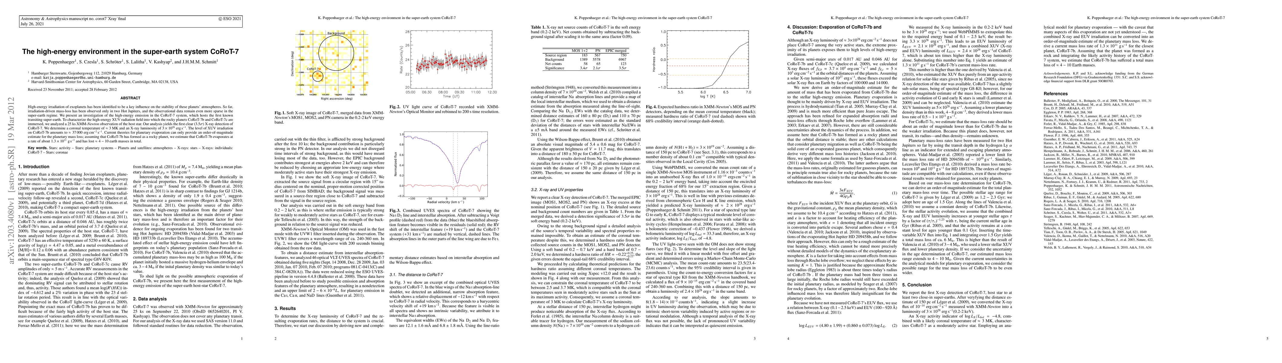 This paper investigates the high-energy environment of the CoRoT-7 system, revealing significant X-ray emission from the host star and estimating substantial mass loss from the super-earth CoRoT-7b due to its intense XUV irradiation. The findings suggest CoRoT-7b could have lost between 4-10 Earth masses over its lifetime.