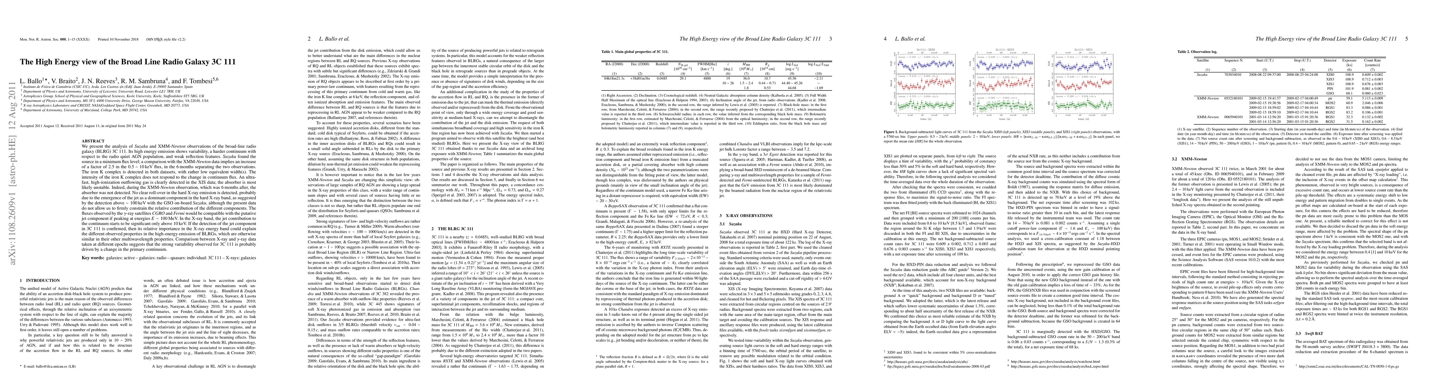 We present the analysis of Suzaku and XMM-Newton observations of the broad-line radio galaxy (BLRG) 3C 111. Its high energy emission shows variability, a harder continuum with respect to the radio quiet AGN population, and weak reflection features. Suzaku found the source in a minimum flux level; a comparison with the XMM-Newton data implies an increase of a factor of 2.5 in the 0.5-10 keV flux, in the 6 months separating the two observations. The iron K complex is detected in both datasets, with rather low equivalent width(s). The intensity of the iron K complex does not respond to the change in continuum flux. An ultra-fast, high-ionization outflowing gas is clearly detected in the XIS data; the absorber is most likely unstable. Indeed, during the XMM-Newton observation, which was 6 months after, the absorber was not detected. No clear roll-over in the hard X-ray emission is detected, probably due to the emergence of the jet as a dominant component in the hard X-ray band, as suggested by the detection above ~ 100 keV with the GSO on-board Suzaku, although the present data do not allow us to firmly constrain the relative contribution of the different components. The fluxes observed by the gamma-ray satellites CGRO and Fermi would be compatible with the putative jet component if peaking at energies E ~ 100 MeV. In the X-ray band, the jet contribution to the continuum starts to be significant only above 10 keV. If the detection of the jet component in 3C 111 is confirmed, then its relative importance in the X-ray energy band could explain the different observed properties in the high-energy emission of BLRGs, which are otherwise similar in their other multiwavelength properties. Comparison between X-ray and gamma-ray data taken at different epochs suggests that the strong variability observed for 3C 111 is probably driven by a change in the primary continuum.