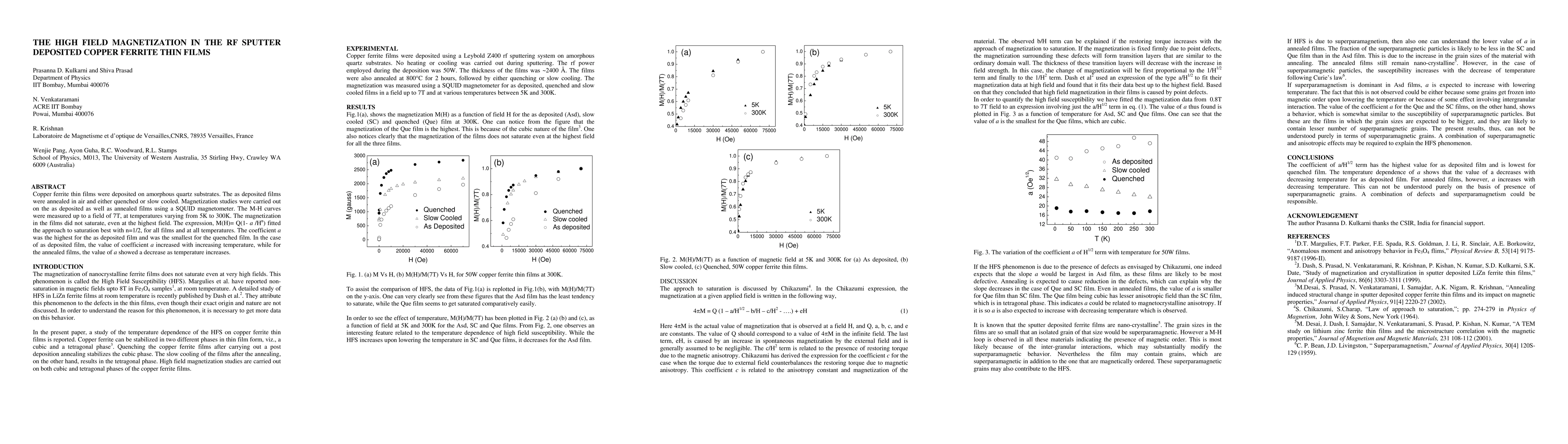 Copper ferrite thin films were deposited on amorphous quartz substrates. The as deposited films were annealed in air and either quenched or slow cooled. Magnetization studies were carried out on the as deposited as well as annealed films using a SQUID magnetometer. The M-H curves were measured up to a field of 7T, at temperatures varying from 5K to 300K. The magnetization in the films did not saturate, even at the highest field. The expression, M(H)= Q(1- a/H^n) fitted the approach to saturation best with n=1/2, for all films and at all temperatures. The coefficient a was the highest for the as deposited film and was the smallest for the quenched film. In the case of as deposited film, the value of coefficient a increased with increasing temperature, while for the annealed films, the value of a showed a decrease as temperature increases.