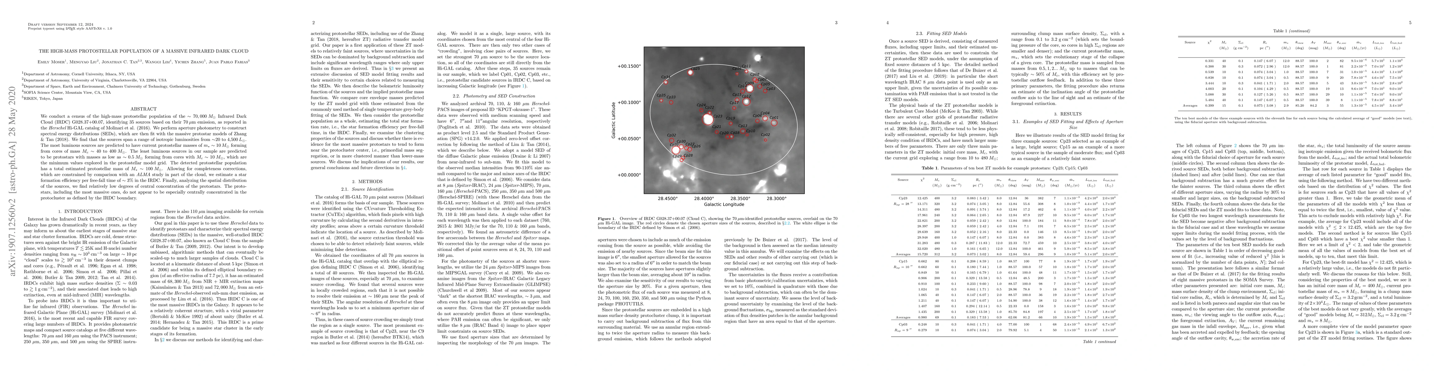 We conduct a census of the high-mass protostellar population of the $\sim70,000\:M_\odot$ Infrared Dark Cloud (IRDC) G028.37+00.07, identifying 35 sources based on their $70\:\mu$m emission, as reported in the {\it Herschel} Hi-GAL catalog of Molinari et al. (2016). We perform aperture photometry to construct spectral energy distributions (SEDs), which are then fit with the massive protostar models of Zhang & Tan (2018). We find that the sources span a range of isotropic luminosities from $\sim$20 to 4,500$\:L_\odot$. The most luminous sources are predicted to have current protostellar masses of $m_{*}\sim10\:M_\odot$ forming from cores of mass $M_{c}\sim40$ to $400\:M_\odot$. The least luminous sources in our sample are predicted to be protostars with masses as low as $\sim 0.5\:M_\odot$ forming from cores with $M_{c}\sim10\:M_\odot$, which are the minimum values explored in the protostellar model grid. The detected protostellar population has a total estimated protostellar mass of $M_{*}\sim 100\:M_\odot$. Allowing for completeness corrections, which are constrained by comparison with an ALMA study in part of the cloud, we estimate a star formation efficiency per free-fall time of $\sim3\%$ in the IRDC. Finally, analyzing the spatial distribution of the sources, we find relatively low degrees of central concentration of the protostars. The protostars, including the most massive ones, do not appear to be especially centrally concentrated in the protocluster as defined by the IRDC boundary.