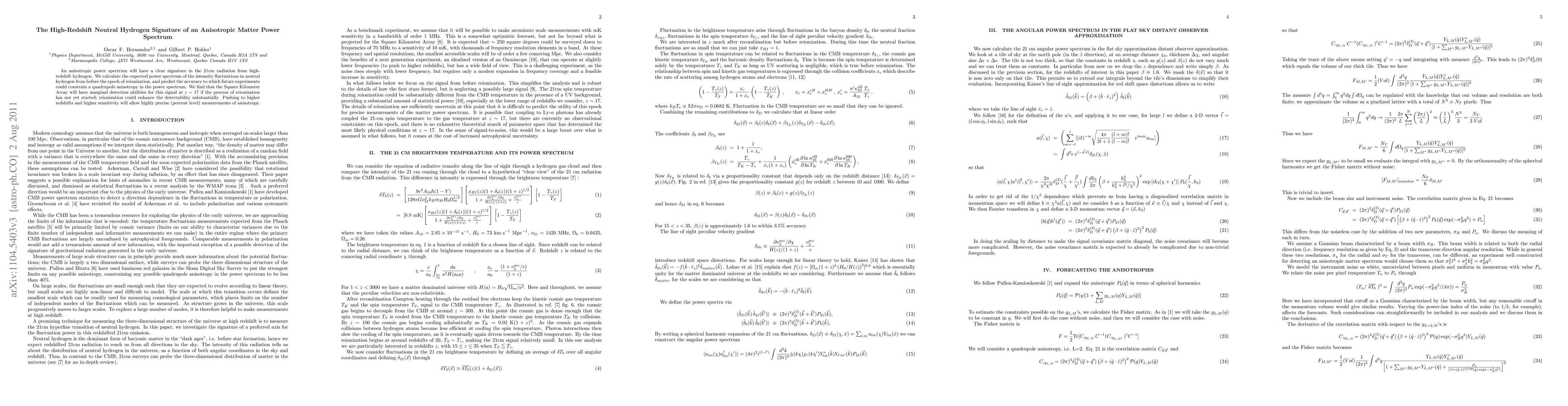 This paper investigates the potential for detecting an anisotropic power spectrum in high-redshift neutral hydrogen through 21cm radiation, predicting that the Square Kilometer Array could marginally detect this signal at z~17 if reionization hasn't begun, with enhanced detectability if reionization occurs. Higher redshifts and sensitivity could enable precise measurements of the anisotropy.