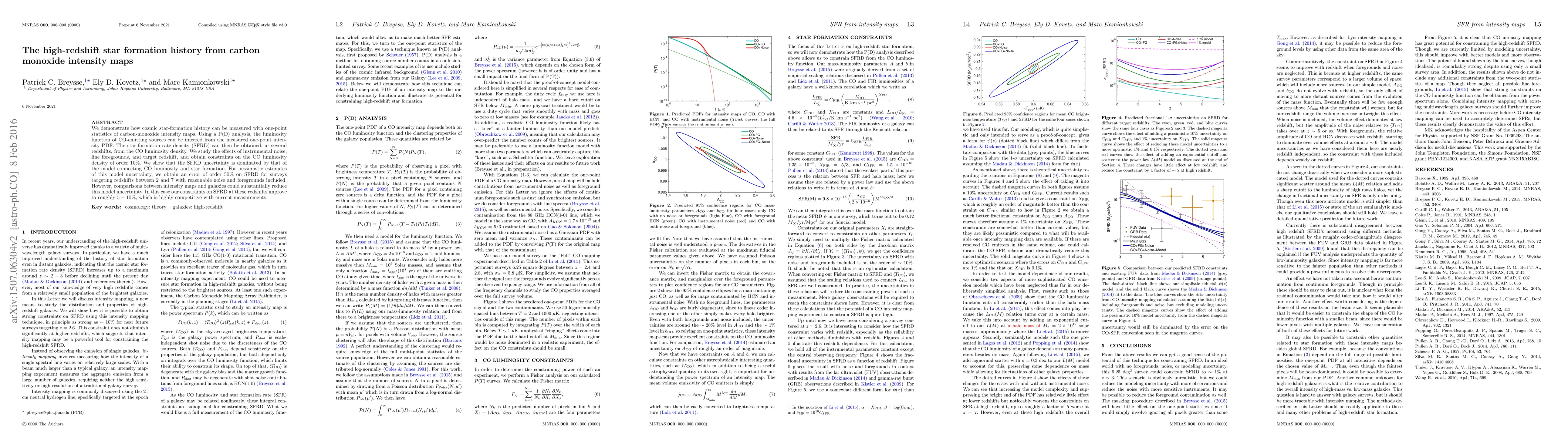 This paper demonstrates a method for measuring cosmic star-formation history using carbon-monoxide intensity maps, inferring luminosity functions, and obtaining star-formation rate density at various redshifts. Despite uncertainties in the CO luminosity-star formation model, the method shows competitive accuracy for redshifts 2-7 when compared with galaxy data.
