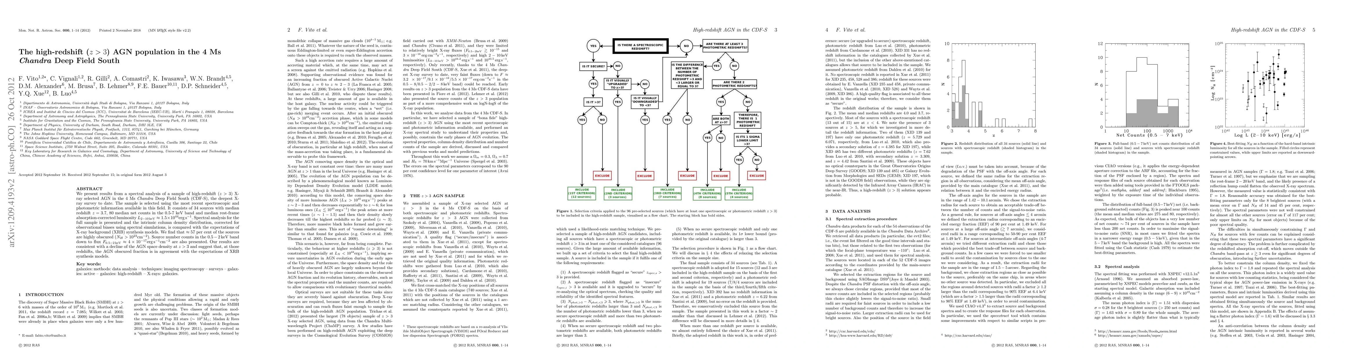 We present results from a spectral analysis of a sample of high-redshift (z>3) X-ray selected AGN in the 4 Ms Chandra Deep Field South (CDF-S), the deepest X-ray survey to date. The sample is selected using the most recent spectroscopic and photometric information available in this field. It consists of 34 sources with median redshift z=3.7, 80 median net counts in the 0.5-7 keV band and median rest-frame absorption-corrected luminosity $L_{2-10 \rmn{keV}}\approx1.5\times10^{44}\rmn{erg} \rmn{s^{-1}}$. Spectral analysis for the full sample is presented and the intrinsic column density distribution, corrected for observational biases using spectral simulations, is compared with the expectations of X-ray background (XRB) synthesis models. We find that $\approx57$ per cent of the sources are highly obscured ($N_H>10^{23}\rmn{cm^{-2}}$). Source number counts in the $0.5-2\rmn{keV}$ band down to flux $F_{0.5-2 \rmn{keV}}\approx4\times10^{-17}\rmn{erg} \rmn{s^{-1}cm^{-2}}$ are also presented. Our results are consistent with a decline of the AGN space density at z>3 and suggest that, at those redshifts, the AGN obscured fraction is in agreement with the expectations of XRB synthesis models.