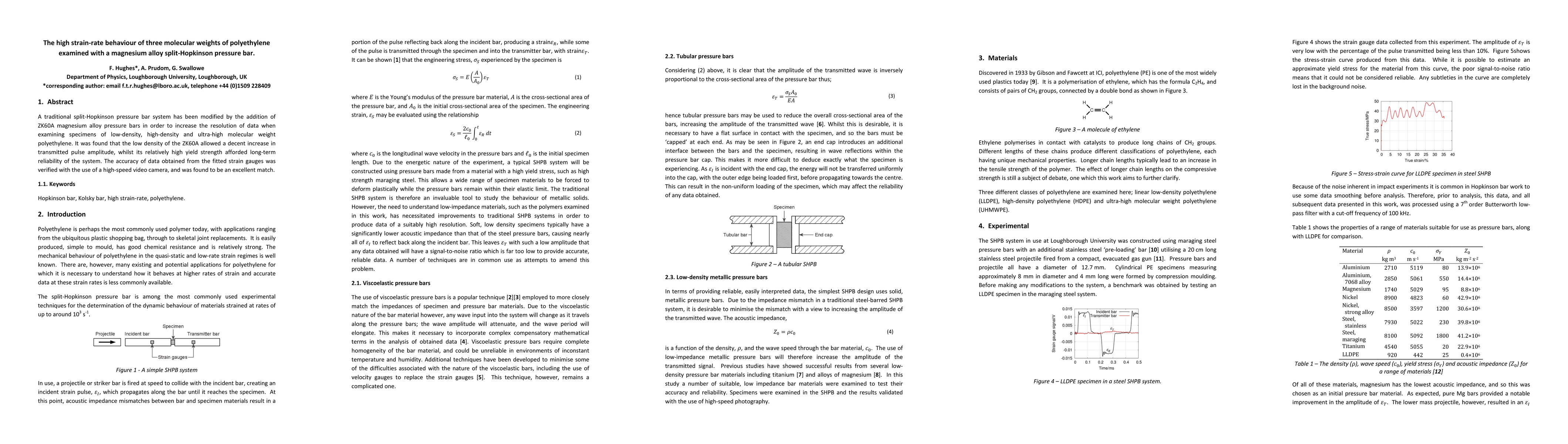 This paper investigates the high strain-rate behavior of three molecular weights of polyethylene using a modified split-Hopkinson pressure bar system with ZK60A magnesium alloy bars, achieving improved data resolution and reliability. The accuracy of the strain gauge data was validated with high-speed video camera footage.