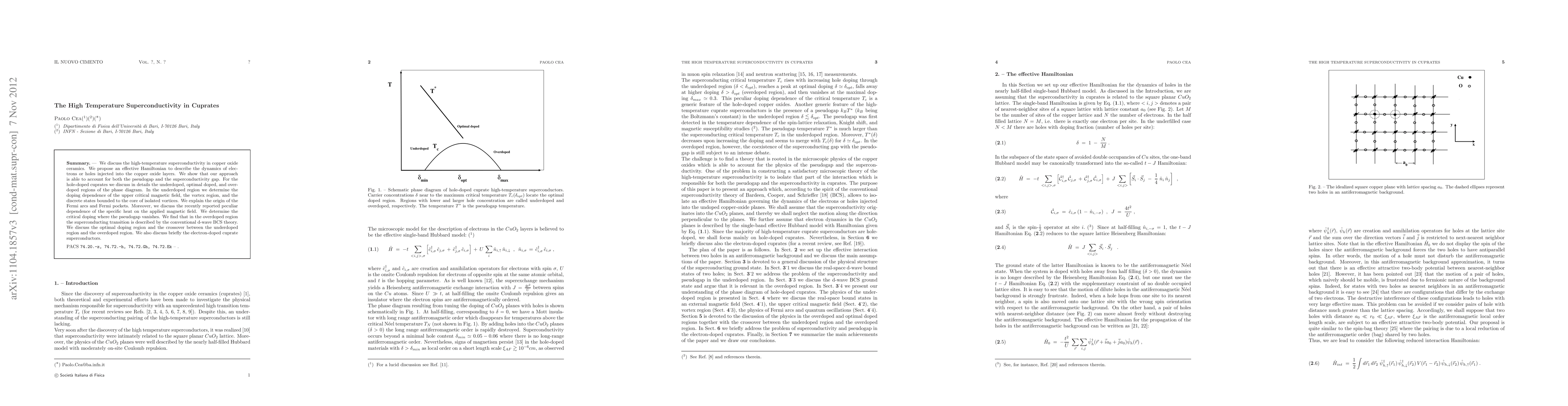 We discuss the high-temperature superconductivity in copper oxide ceramics. We propose an effective Hamiltonian to describe the dynamics of electrons or holes injected into the copper oxide layers. We show that our approach is able to account for both the pseudogap and the superconductivity gap. For the hole-doped cuprates we discuss in details the underdoped, optimal doped, and overdoped regions of the phase diagram. In the underdoped region we determine the doping dependence of the upper critical magnetic field, the vortex region, and the discrete states bounded to the core of isolated vortices. We explain the origin of the Fermi arcs and Fermi pockets. Moreover, we discuss the recently reported peculiar dependence of the specific heat on the applied magnetic field. We determine the critical doping where the pseudogap vanishes. We find that in the overdoped region the superconducting transition is described by the conventional d-wave BCS theory. We discuss the optimal doping region and the crossover between the underdoped region and the overdoped region. We also discuss briefly the electron-doped cuprate superconductors.