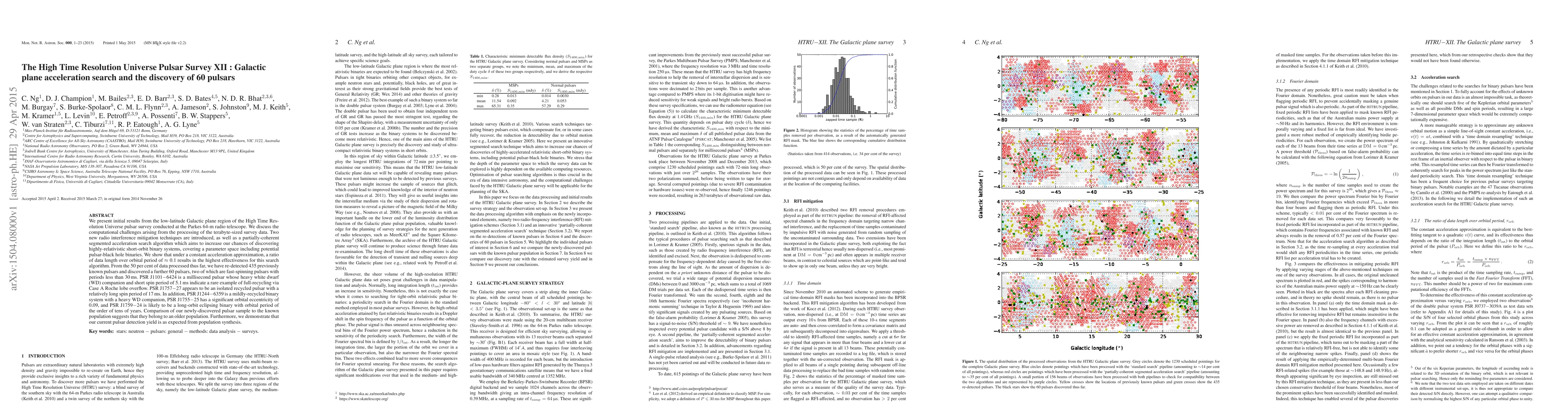 This paper reports on the initial findings from the Galactic plane segment of the High Time Resolution Universe pulsar survey using the Parkes telescope, introducing new data processing techniques and a segmented acceleration search algorithm. The survey has identified 60 new pulsars, including rare fast-spinning and recycled pulsars, and suggests these newly discovered pulsars likely belong to an older population.