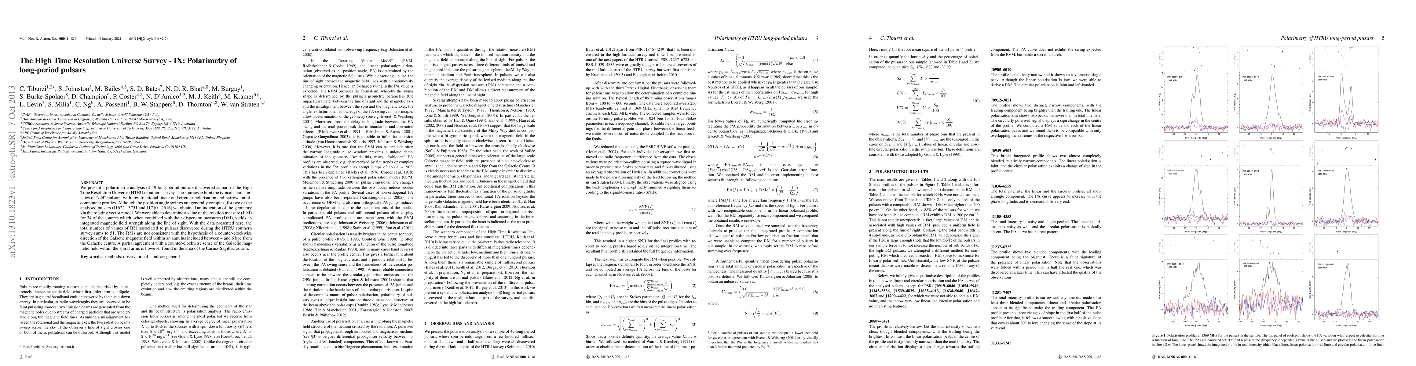 We present a polarimetric analysis of 49 long-period pulsars discovered as part of the High Time Resolution Universe (HTRU) southern survey. The sources exhibit the typical characteristics of "old" pulsars, with low fractional linear and circular polarisation and narrow, multicomponent profiles. Although the position angle swings are generally complex, for two of the analysed pulsars (J1622-3751 and J1710-2616) we obtained an indication of the geometry via the rotating vector model. We were able to determine a value of the rotation measure (RM) for 34 of the sources which, when combined with their dispersion measures (DM), yields an integrated magnetic field strength along the line of sight. With the data presented here, the total number of values of RM associated to pulsars discovered during the HTRU southern survey sums to 51. The RMs are not consistent with the hypothesis of a counter-clockwise direction of the Galactic magnetic field within an annulus included between 4 and 6 kpc from the Galactic centre. A partial agreement with a counter-clockwise sense of the Galactic magnetic field within the spiral arms is however found in the area of the Carina-Sagittarius arm.