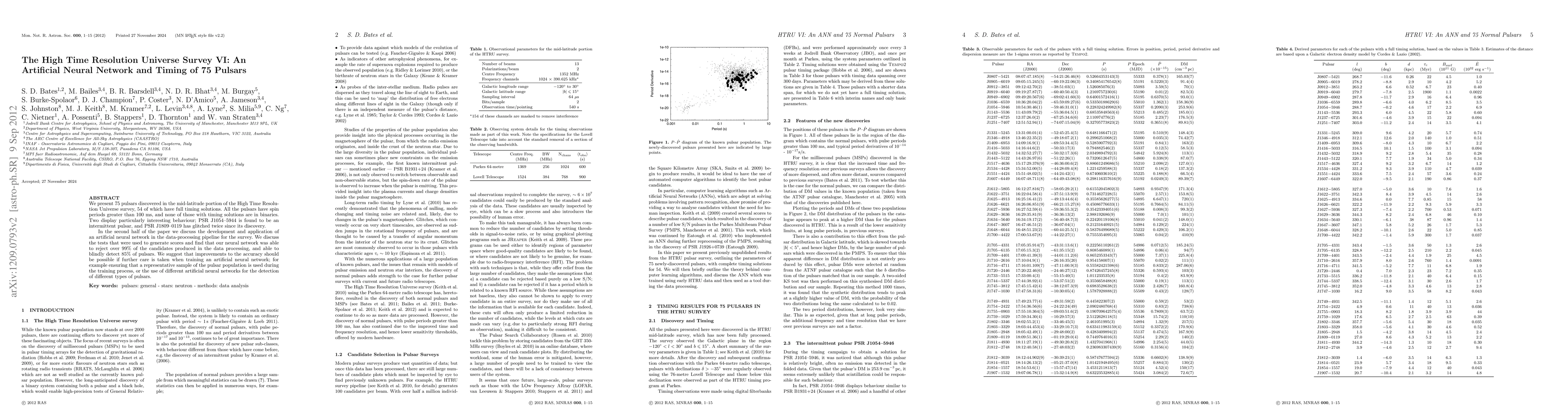 We present 75 pulsars discovered in the mid-latitude portion of the High Time Resolution Universe survey, 54 of which have full timing solutions. All the pulsars have spin periods greater than 100 ms, and none of those with timing solutions are in binaries. Two display particularly interesting behaviour; PSR J1054-5944 is found to be an intermittent pulsar, and PSR J1809-0119 has glitched twice since its discovery. In the second half of the paper we discuss the development and application of an artificial neural network in the data-processing pipeline for the survey. We discuss the tests that were used to generate scores and find that our neural network was able to reject over 99% of the candidates produced in the data processing, and able to blindly detect 85% of pulsars. We suggest that improvements to the accuracy should be possible if further care is taken when training an artificial neural network; for example ensuring that a representative sample of the pulsar population is used during the training process, or the use of different artificial neural networks for the detection of different types of pulsars.