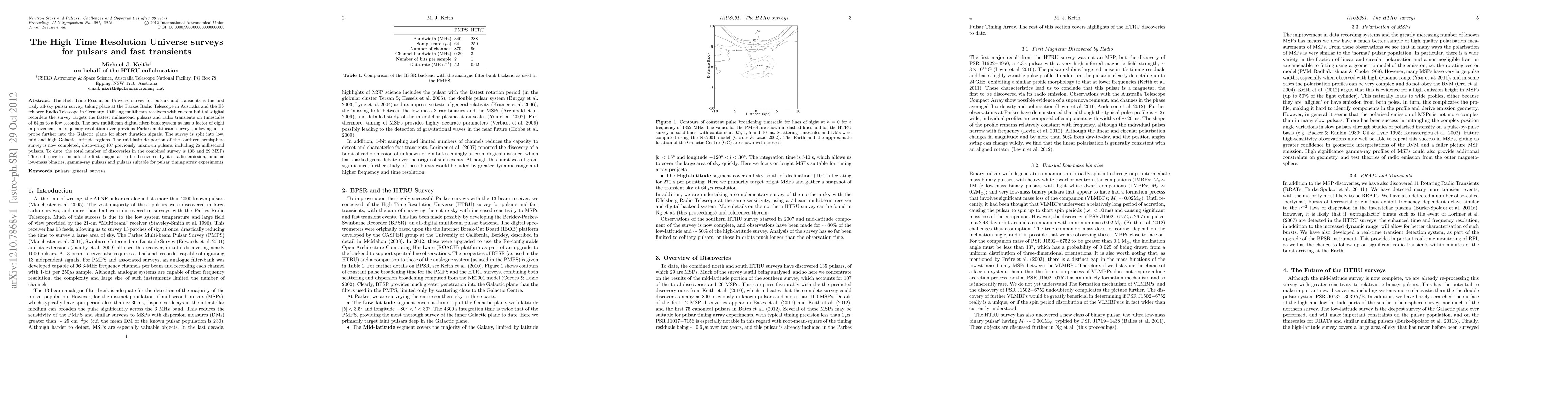 The High Time Resolution Universe survey, conducted at Parkes and Effelsberg telescopes, has completed its mid-latitude southern hemisphere portion, discovering 107 new pulsars, including 26 millisecond pulsars, and advancing frequency resolution for probing short duration signals. To date, the survey has found a total of 135 pulsars, including the first magnetar detected via radio emission.
