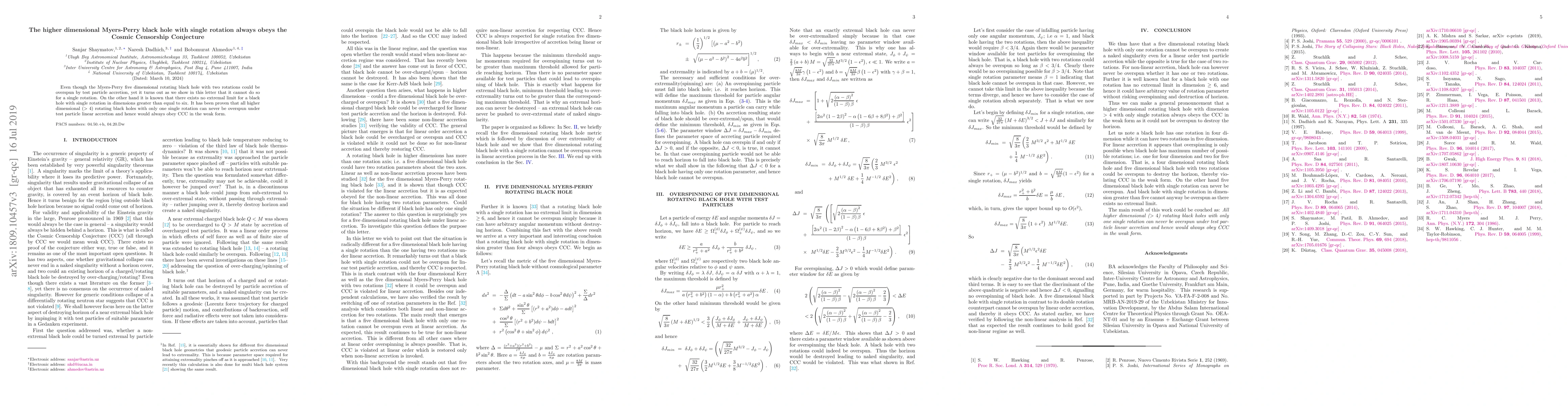 Even though the Myers-Perry five dimensional rotating black hole with two rotations could be overspun by test particle accretion, yet it turns out as we show in this letter that it cannot do so for a single rotation. On the other hand it is known that there exists no extremal limit for a black hole with single rotation in dimensions greater than equal to six. It has been proven that all higher dimensional ($>4$) rotating black holes with only one single rotation can never be overspun under test particle linear accretion and hence would always obey CCC in the weak form.