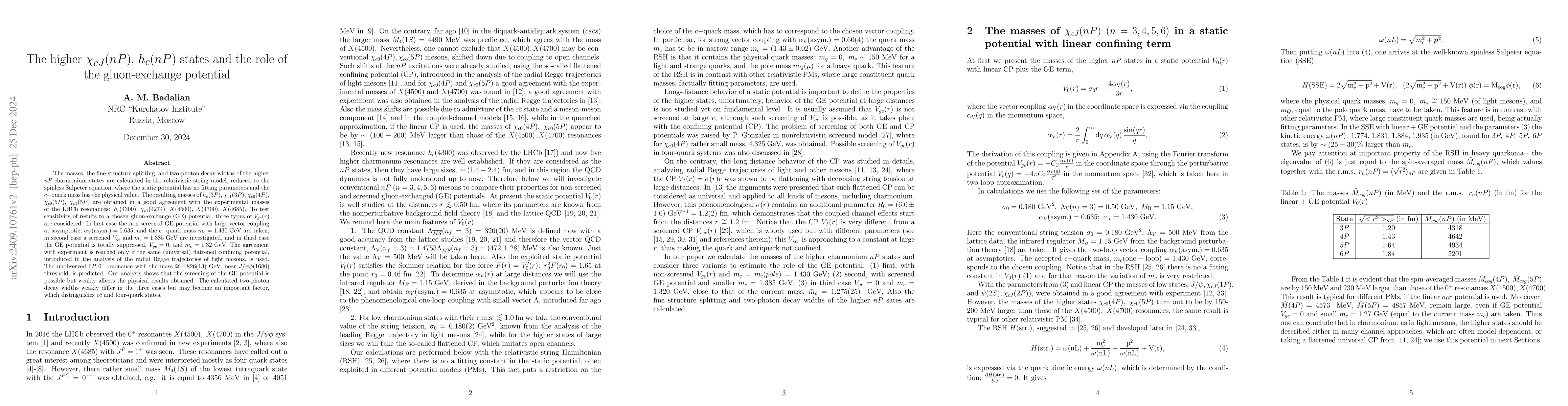 The masses, the fine-structure splitting, and two-photon decay widths of the higher $nP$-charmonium states are calculated in the relativistic string model, reduced to the spinless Salpeter equation, where the static potential has no fitting parameters and the $c-$quark mass has the physical value. The resulting masses of $h_c(3P)$, $\chi_{c1}(3P)$, $\chi_{c0}(4P)$, $\chi_{c0}(5P)$, $\chi_{c1}(5P)$ are obtained in a good agreement with the experimental masses of the LHCb resonances: $h_c(4300)$, $\chi_{c1}(4274)$, $X(4500)$, $X(4700)$, $X(4685)$. To test sensitivity of results to a chosen gluon-exchange (GE) potential, three types of $V_{ge}(r)$ are considered. In first case the non-screened GE potential with large vector coupling at asymptotic, $\alpha_{\rm V}(\rm asym.)=0.635$, and the $c$-quark mass $m_c=1.430$ GeV are taken; in second case a screened $V_{ge}$ and $m_c=1.385$ are investigated, and in third case the GE potential is totally suppressed, $V_{ge}=0$, and $m_c=1.32$ GeV. The agreement with experiment is reached only if the same (universal) flattened confining potential, introduced in the analysis of the radial Regge trajectories of light mesons, is used. The unobserved $6P,0^+$ resonance with the mass $\cong 4.81$ GeV, near $J/\psi\phi(1680)$ threshold, is predicted. Our analysis shows that the screening of the GE potential is possible but weakly affects the physical results obtained. The calculated two-photon decay widths weakly differ in the three cases but may become an important factor, which distinguishes $c\bar c$ and four-quark states.