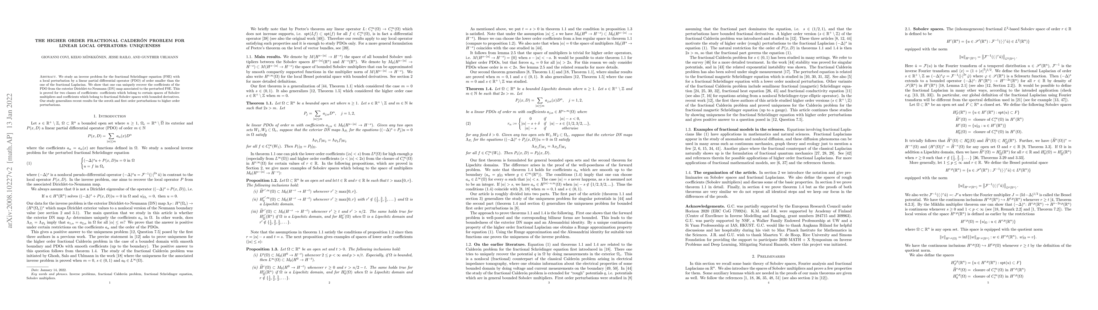 We study an inverse problem for the fractional Schr\"odinger equation (FSE) with a local perturbation by a linear partial differential operator (PDO) of order smaller than the order of the fractional Laplacian. We show that one can uniquely recover the coefficients of the PDO from the Dirichlet-to-Neumann (DN) map associated to the perturbed FSE. This is proved for two classes of coefficients: coefficients which belong to certain spaces of Sobolev multipliers and coefficients which belong to fractional Sobolev spaces with bounded derivatives. Our study generalizes recent results for the zeroth and first order perturbations to higher order perturbations.