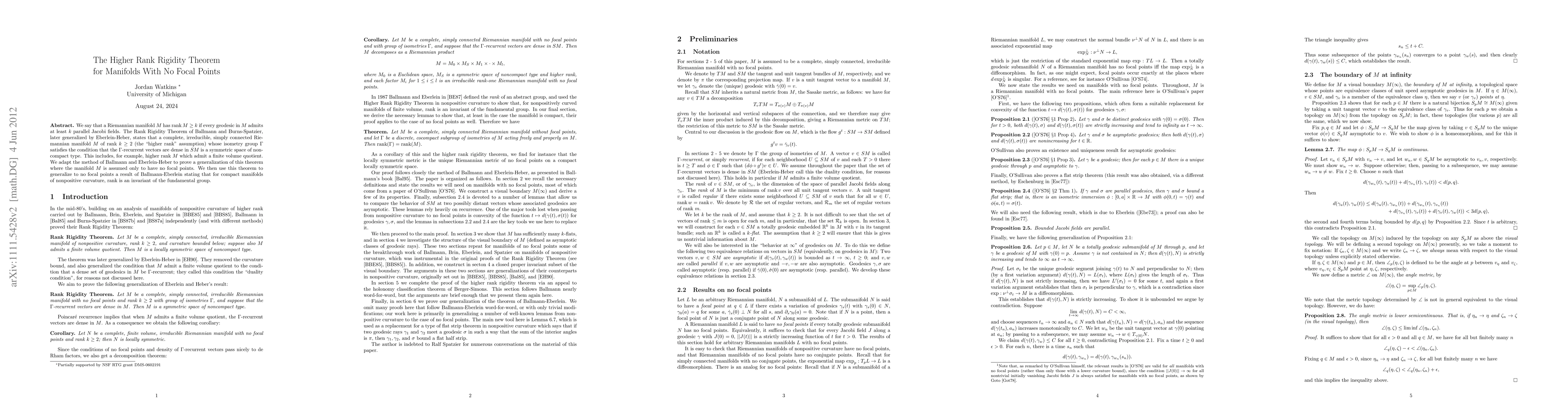We say that a Riemannian manifold M has rank at least k if every geodesic in M admits at least k parallel Jacobi fields. The Rank Rigidity Theorem of Ballmann and Burns-Spatzier, later generalized by Eberlein-Heber, states that a complete, irreducible, simply connected Riemannian manifold M of rank at least 2 (the higher rank assumption), whose isometry group satisfies the condition that the recurrent vectors are dense in the unit tangent bundle SM (the duality condition), is a symmetric space of noncompact type. This includes, for example, higher rank M which admit a finite volume quotient. We adapt the method of Ballmann and Eberlein-Heber to prove a generalization of this theorem where the manifold M is assumed only to have no focal points. We then use this theorem to generalize to no focal points a result of Ballmann-Eberlein stating that for compact manifolds of nonpositive curvature, rank is an invariant of the fundamental group.