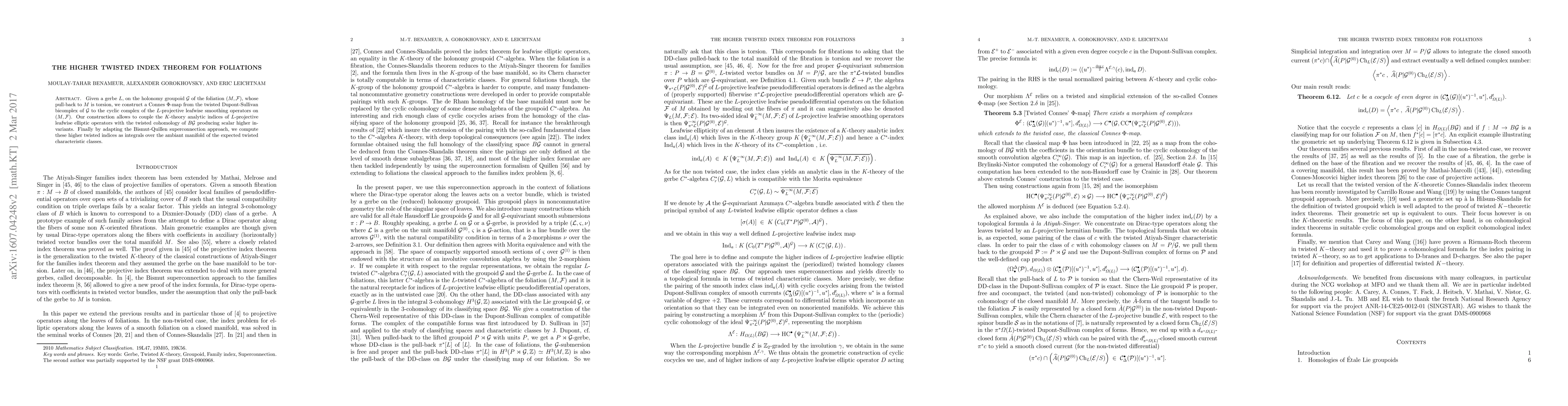 Given a gerbe $L$, on the holonomy groupoid $\mathcal G$ of the foliation $(M, \mathcal F)$, whose pull-back to $M$ is torsion, we construct a Connes $\Phi$-map from the twisted Dupont-Sullivan bicomplex of $\mathcal G$ to the cyclic complex of the $L$-projective leafwise smoothing operators on $(M, \mathcal F)$. Our construction allows to couple the $K$-theory analytic indices of $L$-projective leafwise elliptic operators with the twisted cohomology of $B\mathcal G$ producing scalar higher invariants. Finally by adapting the Bismut-Quillen superconnection approach, we compute these higher twisted indices as integrals over the ambiant manifold of the expected twisted characteristic classes.