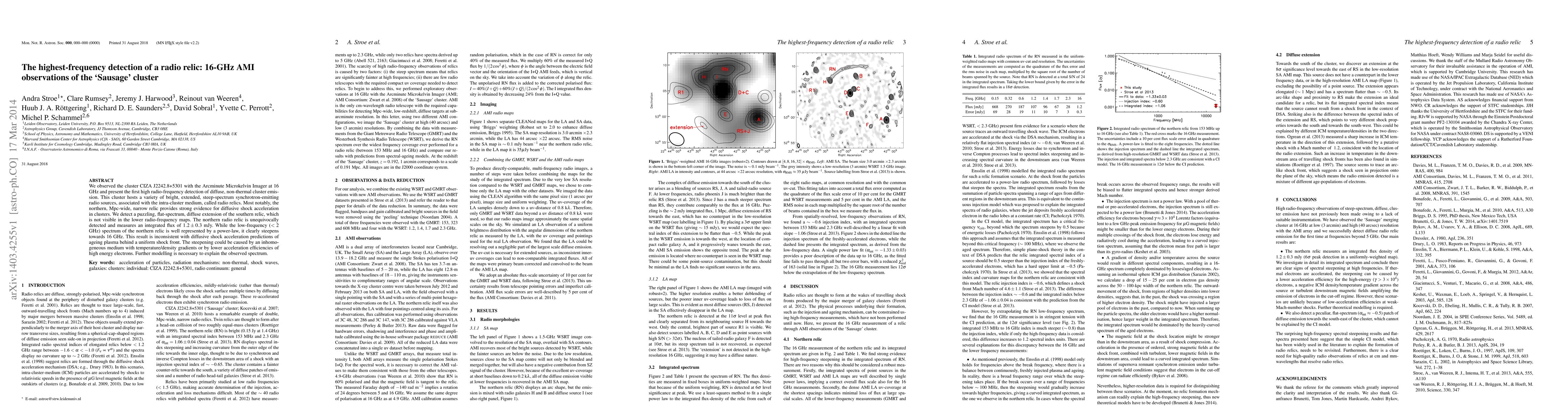 We observed the cluster CIZA J2242.8+5301 with the Arcminute Microkelvin Imager at $16$ GHz and present the first high radio-frequency detection of diffuse, non-thermal cluster emission. This cluster hosts a variety of bright, extended, steep-spectrum synchrotron-emitting radio sources, associated with the intra-cluster medium, called radio relics. Most notably, the northern, Mpc-wide, narrow relic provides strong evidence for diffusive shock acceleration in clusters. We detect a puzzling, flat-spectrum, diffuse extension of the southern relic, which is not visible in the lower radio-frequency maps. The northern radio relic is unequivocally detected and measures an integrated flux of $1.2\pm0.3$ mJy. While the low-frequency ($<2$ GHz) spectrum of the northern relic is well represented by a power-law, it clearly steepens towards $16$ GHz. This result is inconsistent with diffusive shock acceleration predictions of ageing plasma behind a uniform shock front. The steepening could be caused by an inhomogeneous medium with temperature/density gradients or by lower acceleration efficiencies of high energy electrons. Further modelling is necessary to explain the observed spectrum.