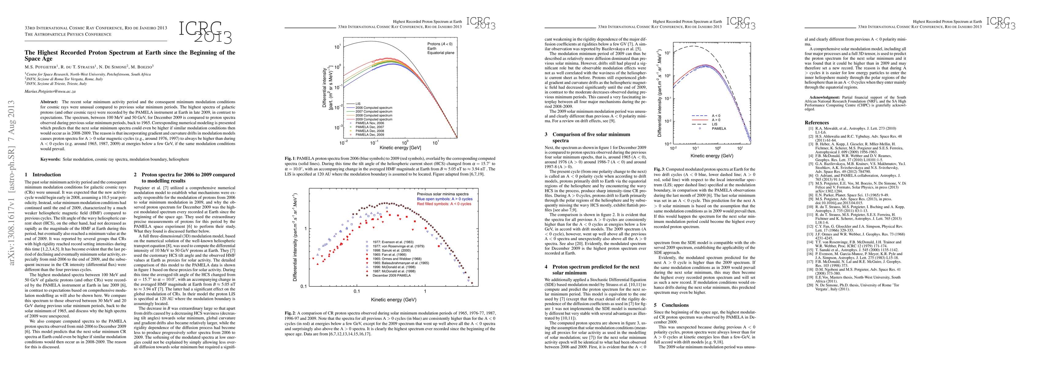 Researchers found the highest recorded proton spectrum at Earth since the beginning of the space age in 2009, with spectra potentially even higher during future solar minimum periods. This is unusual compared to previous solar minimum periods.