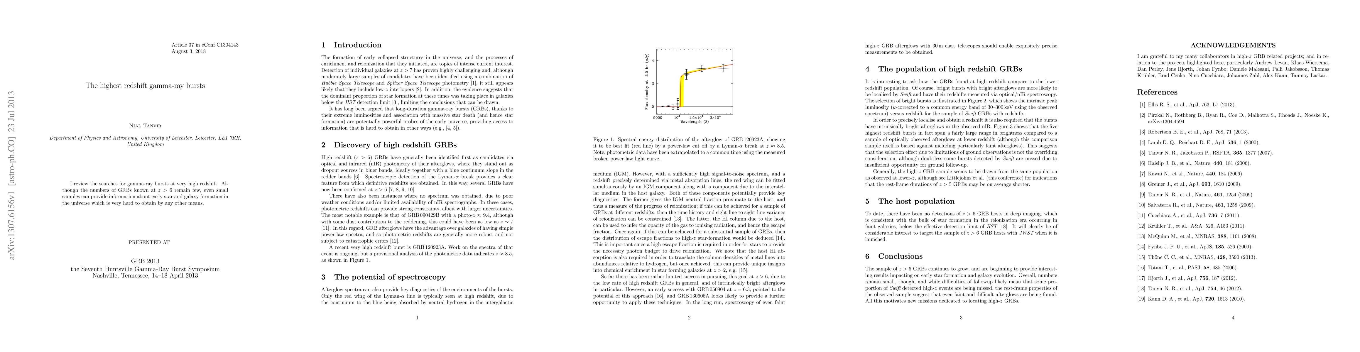The research reviews the searches for gamma-ray bursts (GRBs) at very high redshift (z>6), identifying them via optical and infrared photometry of their afterglows, with spectroscopic detection of the Lyman-α break providing definitive redshifts.