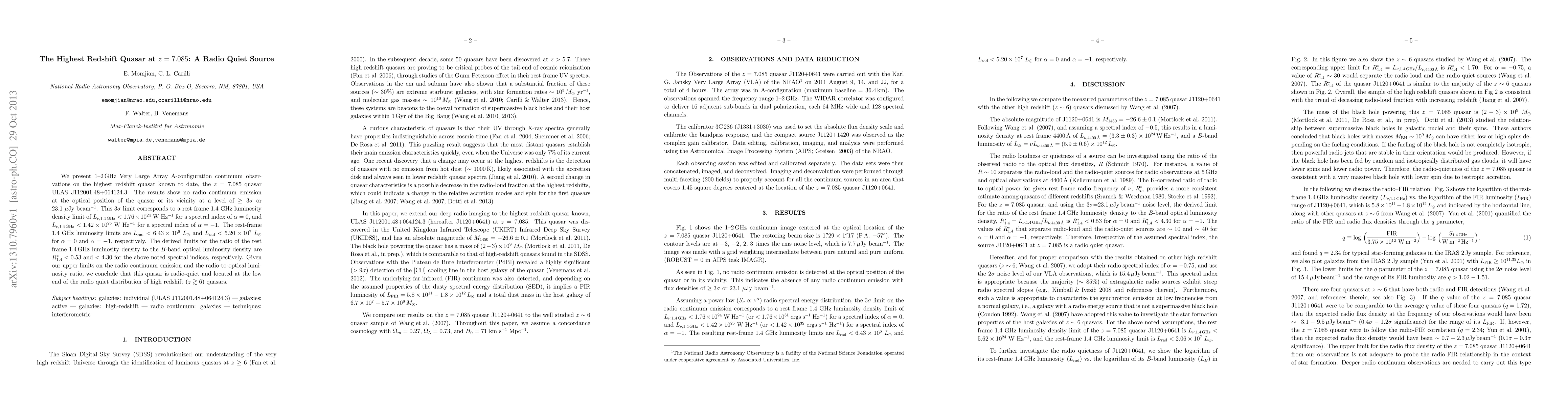 This paper reports on observations of the highest redshift quasar at $z=7.085$, revealing no detectable radio continuum emission at its position, indicating a radio-quiet nature and placing it at the low end of the radio quiet distribution among high redshift quasars.