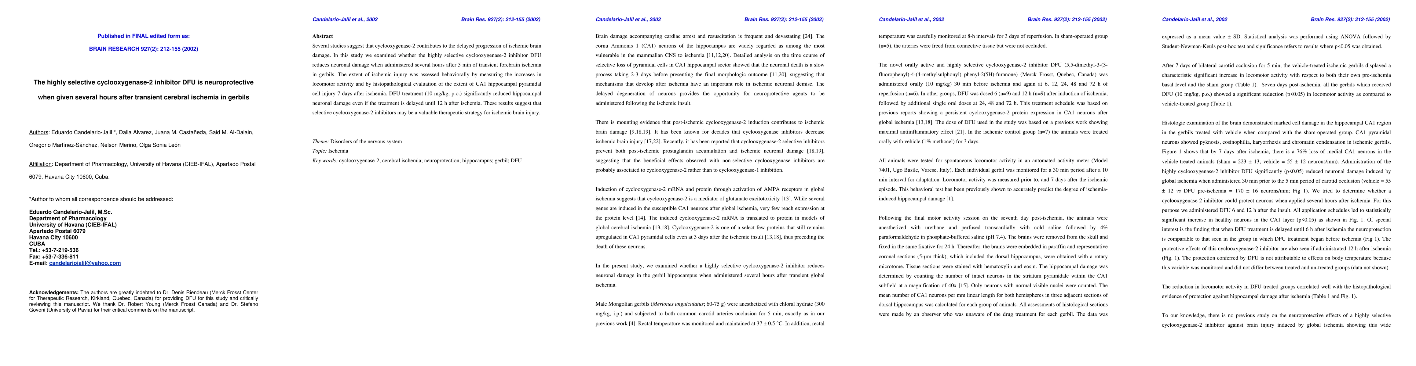 This study found that the selective COX-2 inhibitor DFU significantly reduces hippocampal neuronal damage in gerbils when administered up to 12 hours post-transient cerebral ischemia, indicating potential therapeutic benefits for ischemic brain injury even with delayed treatment.