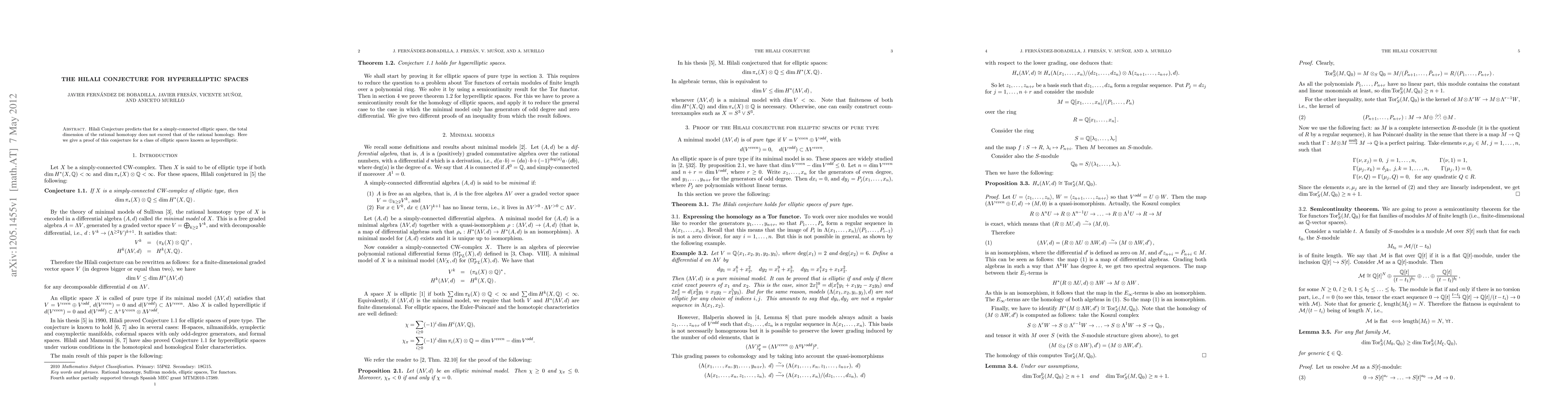Summary: The Hilali Conjecture, which posits that the total dimension of rational homotopy does not exceed that of rational homology for simply-connected elliptic spaces, is proven for hyperelliptic spaces. This result extends the understanding of the conjecture's applicability to a broader class of elliptic spaces.