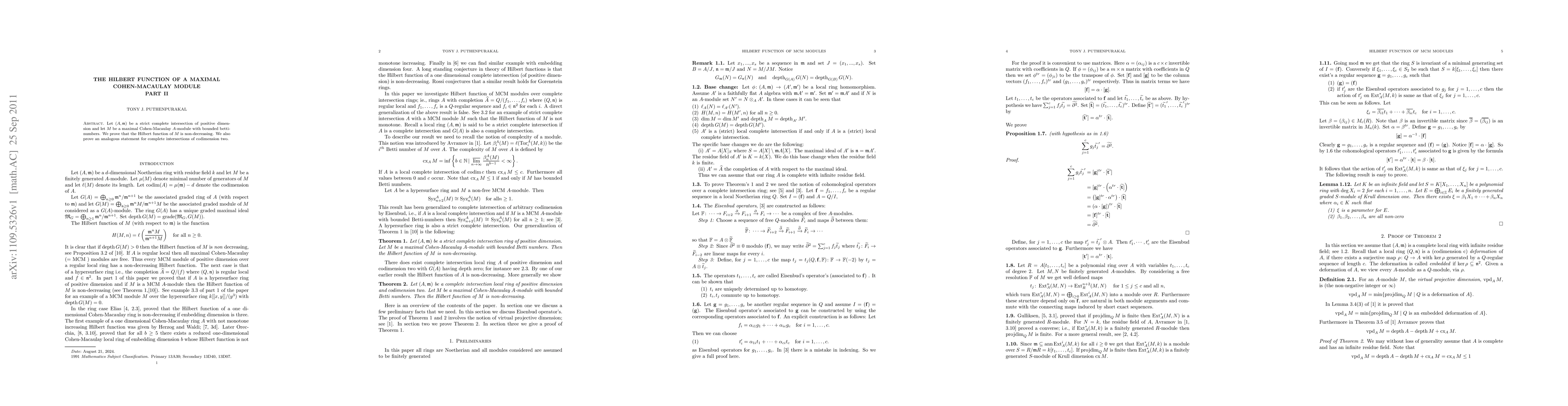 Researchers prove that the Hilbert function of a maximal Cohen-Macaulay module in a strict complete intersection is non-decreasing, with an analogous statement for complete intersections of codimension two.