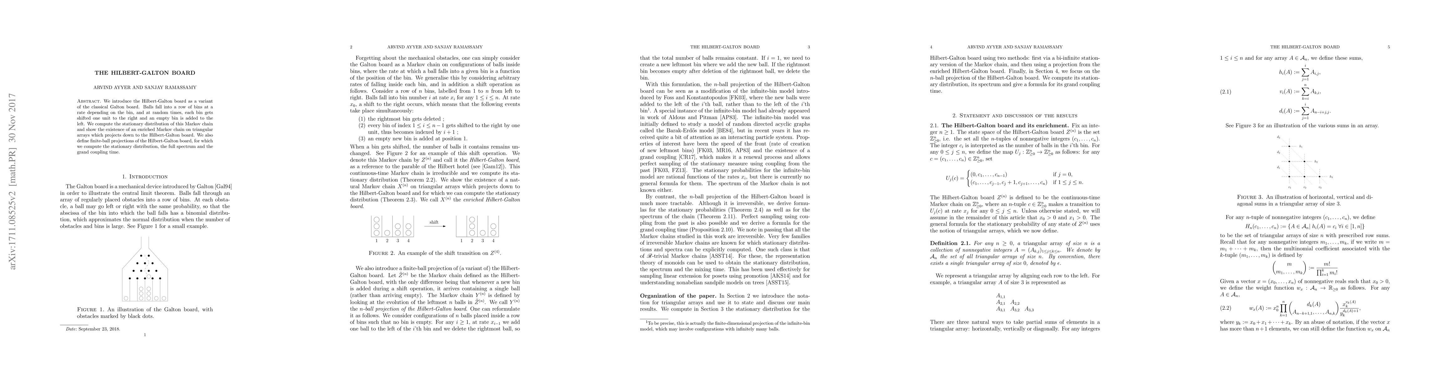 We introduce the Hilbert-Galton board as a variant of the classical Galton board. Balls fall into a row of bins at a rate depending on the bin, and at random times, each bin gets shifted one unit to the right and an empty bin is added to the left. We compute the stationary distribution of this Markov chain and show the existence of an enriched Markov chain on triangular arrays of numbers which projects down to the Hilbert-Galton board. We also define finite-ball projections of the Hilbert-Galton board, for which we compute the stationary distribution, the full spectrum and the grand coupling time.