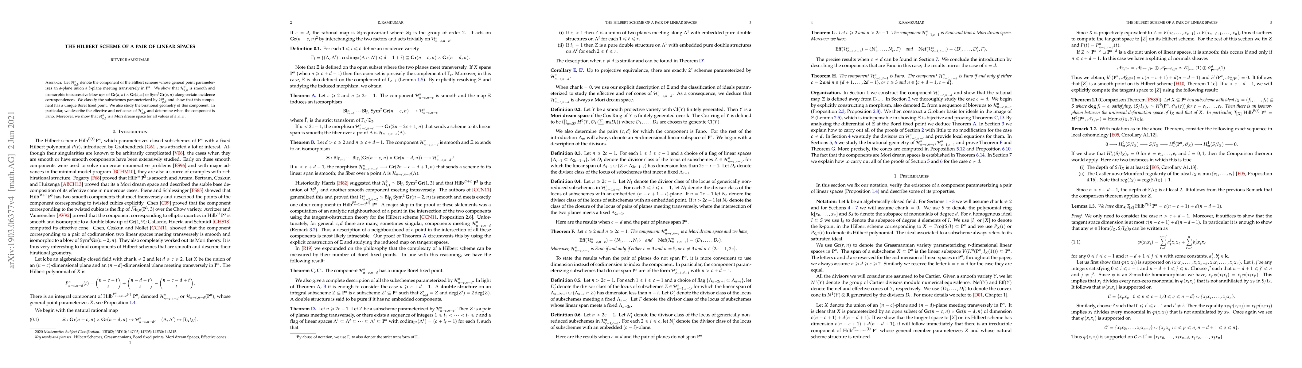 Researchers show that the Hilbert scheme of a pair of linear spaces is smooth and can be described as successive blow-ups of certain Grassmannian varieties, with implications for birational geometry and Mori dream spaces.