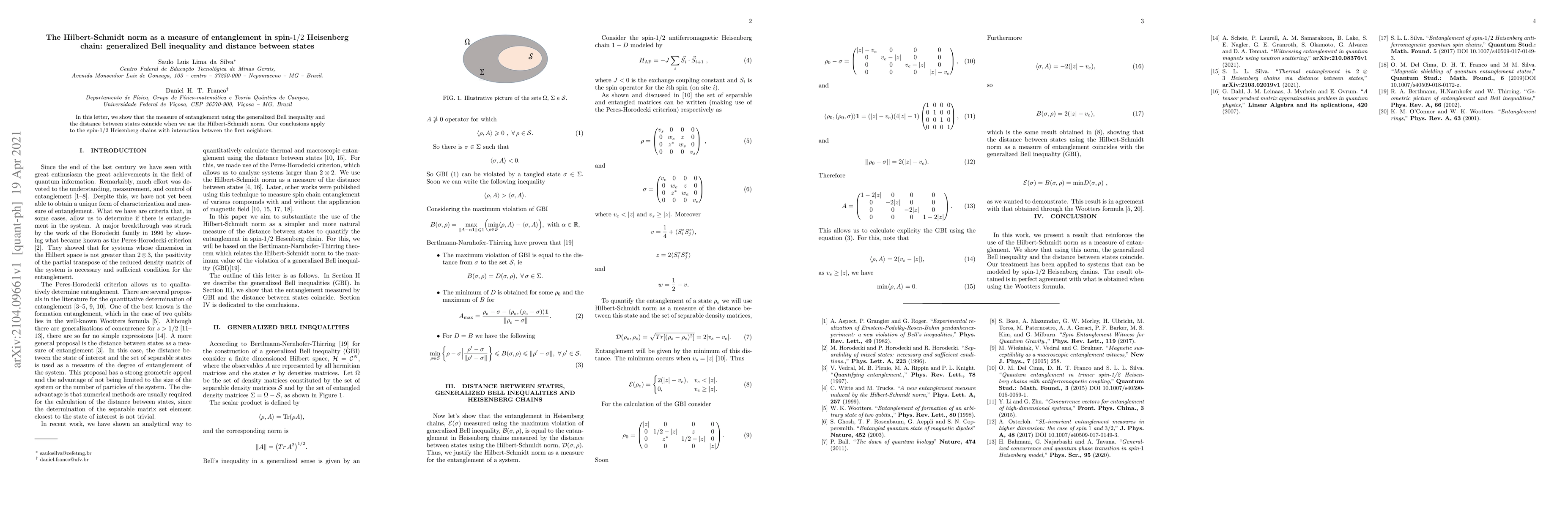 This paper demonstrates that the Hilbert-Schmidt norm effectively measures entanglement in spin-1/2 Heisenberg chains, showing that it aligns with the generalized Bell inequality and the distance between quantum states. The findings are particularly relevant for spin-1/2 systems with nearest-neighbor interactions.
