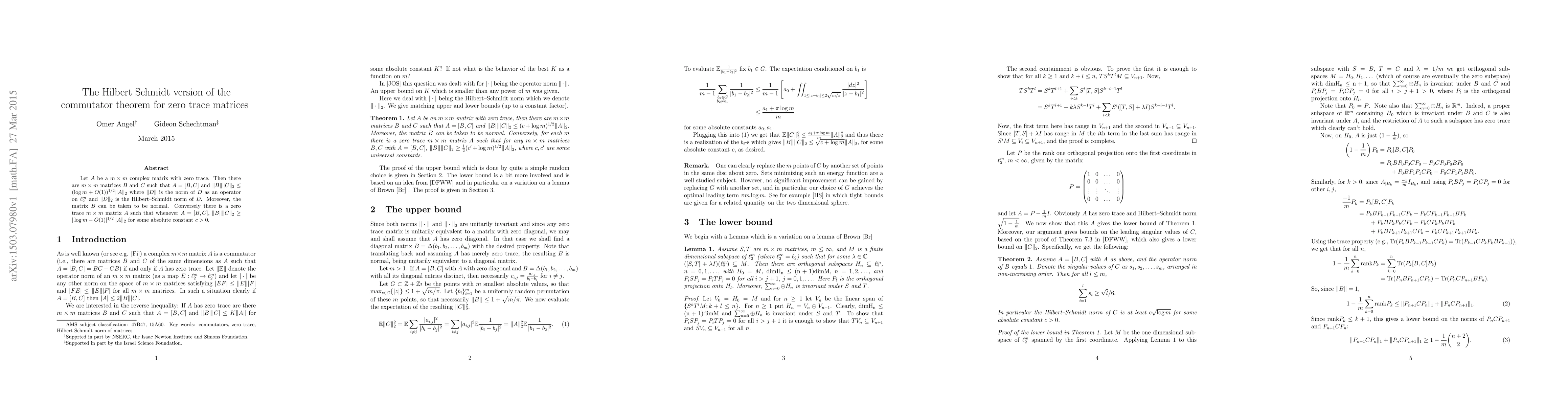 Let $A$ be a $m\times m$ complex matrix with zero trace. Then there are $m\times m$ matrices $B$ and $C$ such that $A=[B,C]$ and $\|B\|\|C\|_2\le (\log m+O(1))^{1/2}\|A\|_2$ where $\|D\|$ is the norm of $D$ as an operator on $\ell_2^m$ and $\|D\|_2$ is the Hilbert--Schmidt norm of $D$. Moreover, the matrix $B$ can be taken to be normal. Conversely there is a zero trace $m\times m$ matrix $A$ such that whenever $A=[B,C]$, $\|B\|\|C\|_2\ge |\log m-O(1)|^{1/2}\|A\|_2$ for some absolute constant $c>0$.