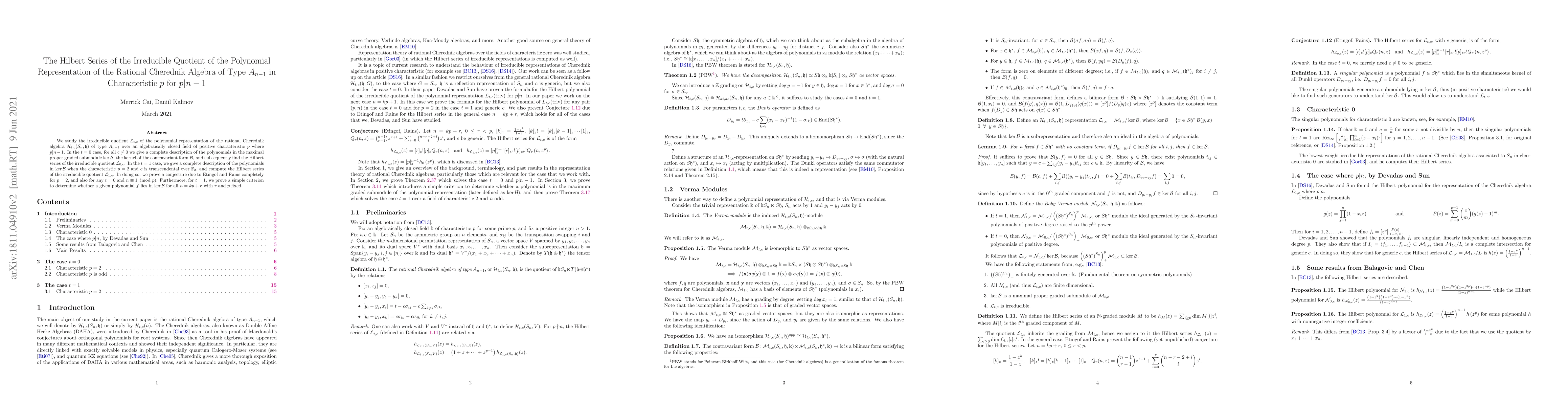 The paper studies the Hilbert series of the irreducible quotient of a specific algebra in positive characteristic, providing complete descriptions for certain cases and proving conjectures about polynomial representation.