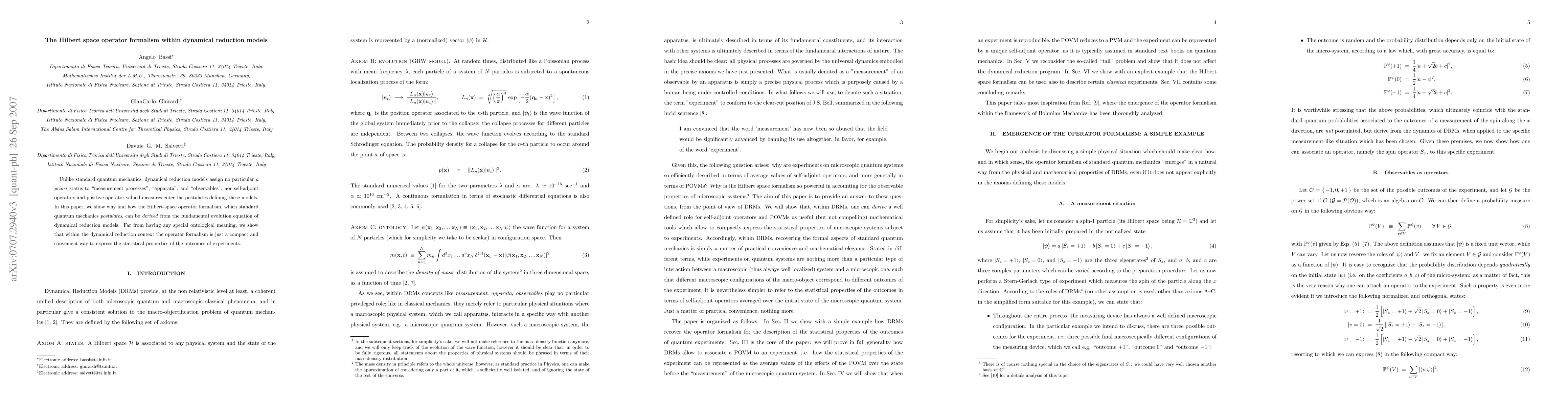 This paper demonstrates how the Hilbert-space operator formalism of standard quantum mechanics can be derived from the fundamental evolution equation of dynamical reduction models, showing that it is merely a convenient expression for statistical properties rather than having special ontological significance. Unlike standard quantum mechanics, dynamical reduction models do not prioritize measurement processes or specific operators.