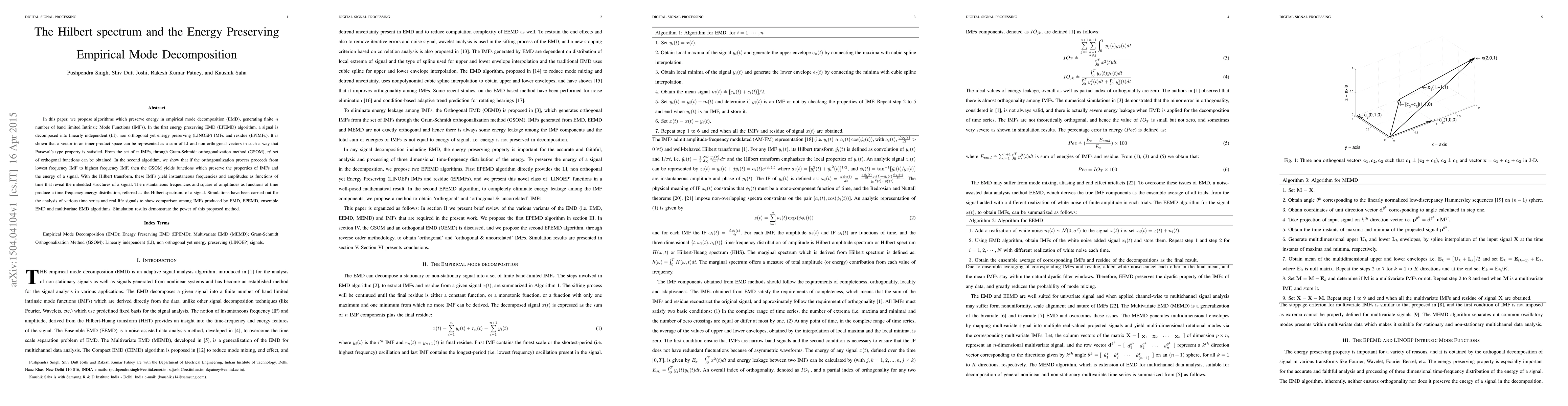 In this paper, we propose algorithms which preserve energy in empirical mode decomposition (EMD), generating finite $n$ number of band limited Intrinsic Mode Functions (IMFs). In the first energy preserving EMD (EPEMD) algorithm, a signal is decomposed into linearly independent (LI), non orthogonal yet energy preserving (LINOEP) IMFs and residue (EPIMFs). It is shown that a vector in an inner product space can be represented as a sum of LI and non orthogonal vectors in such a way that Parseval's type property is satisfied. From the set of $n$ IMFs, through Gram-Schmidt orthogonalization method (GSOM), $n!$ set of orthogonal functions can be obtained. In the second algorithm, we show that if the orthogonalization process proceeds from lowest frequency IMF to highest frequency IMF, then the GSOM yields functions which preserve the properties of IMFs and the energy of a signal. With the Hilbert transform, these IMFs yield instantaneous frequencies and amplitudes as functions of time that reveal the imbedded structures of a signal. The instantaneous frequencies and square of amplitudes as functions of time produce a time-frequency-energy distribution, referred as the Hilbert spectrum, of a signal. Simulations have been carried out for the analysis of various time series and real life signals to show comparison among IMFs produced by EMD, EPEMD, ensemble EMD and multivariate EMD algorithms. Simulation results demonstrate the power of this proposed method.
