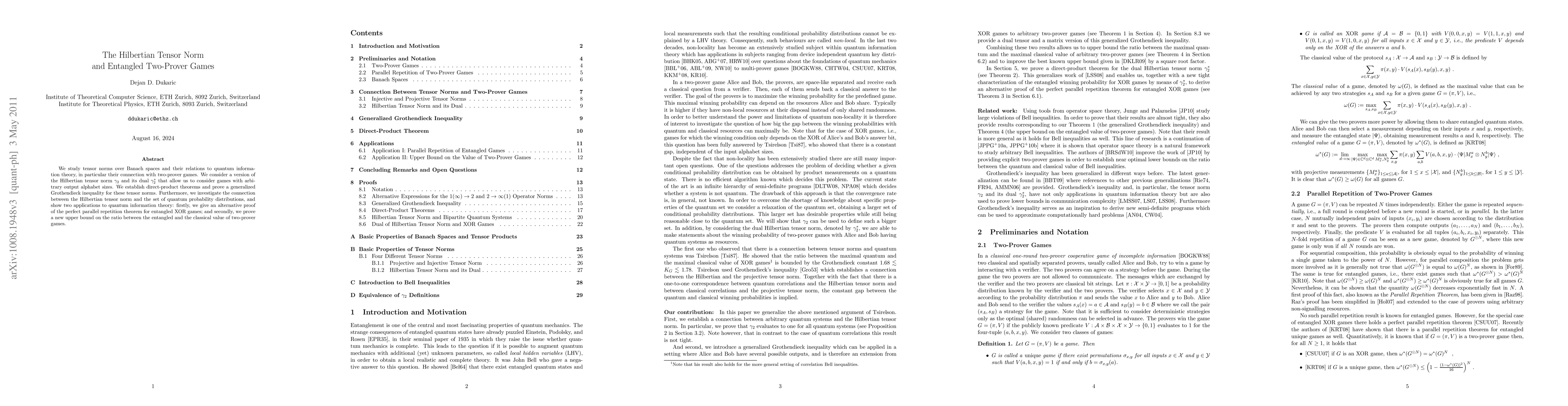 We study tensor norms over Banach spaces and their relations to quantum information theory, in particular their connection with two-prover games. We consider a version of the Hilbertian tensor norm $\gamma_2$ and its dual $\gamma_2^*$ that allow us to consider games with arbitrary output alphabet sizes. We establish direct-product theorems and prove a generalized Grothendieck inequality for these tensor norms. Furthermore, we investigate the connection between the Hilbertian tensor norm and the set of quantum probability distributions, and show two applications to quantum information theory: firstly, we give an alternative proof of the perfect parallel repetition theorem for entangled XOR games; and secondly, we prove a new upper bound on the ratio between the entangled and the classical value of two-prover games.