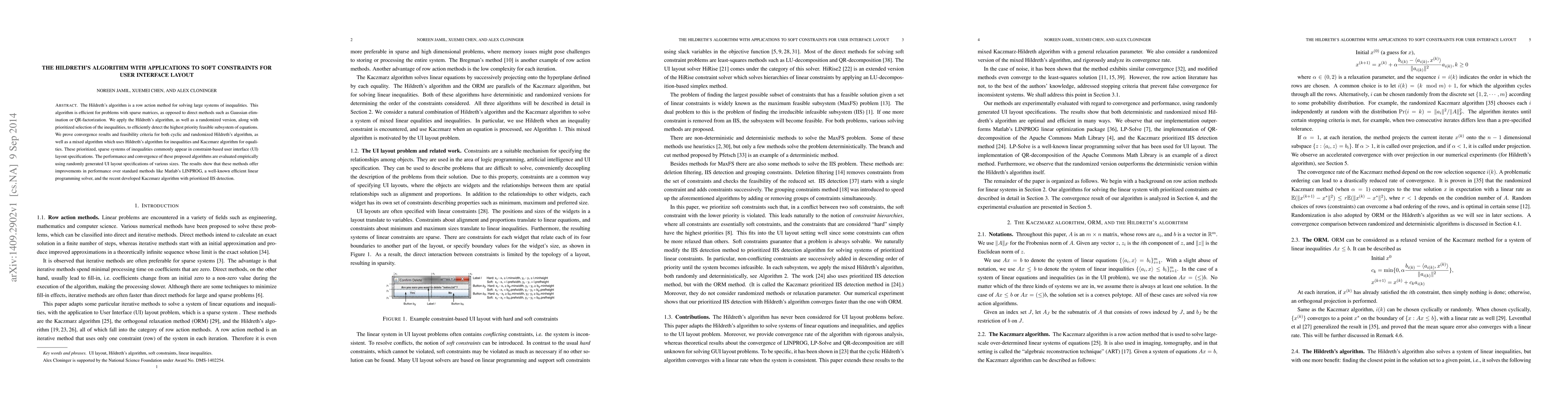 This paper introduces the application of Hildreth's algorithm, a row action method for sparse systems, to efficiently solve priority-based soft constraints in user interface layout specifications. The authors prove convergence results for cyclic and randomized Hildreth's algorithms, and present a mixed algorithm combining Hildreth's and Kaczmarz methods. Empirical testing with random UI layout specifications demonstrates improved performance over traditional methods like Matlab's LINPROG and a recent Kaczmarz algorithm with prioritized IIS detection.