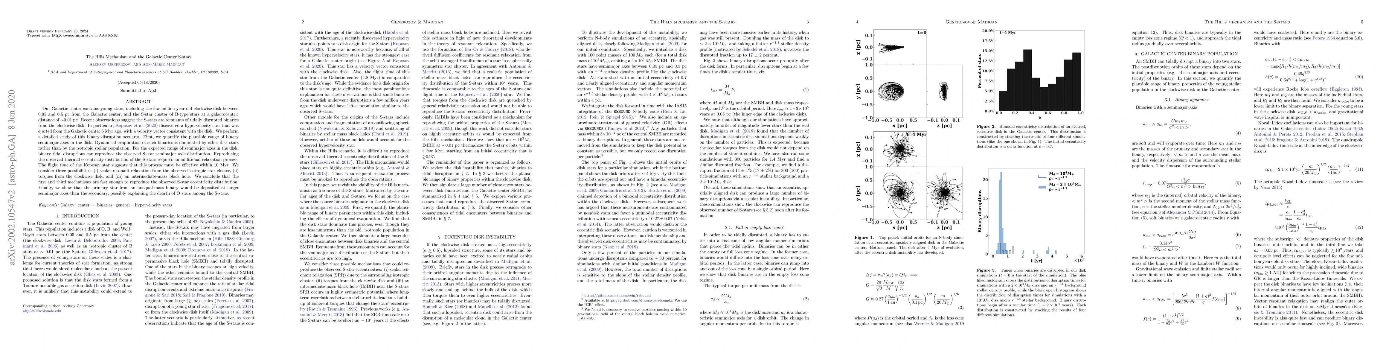 Our Galactic center contains young stars, including the few million year old clockwise disk between 0.05 and 0.5 pc from the Galactic center, and the S-star cluster of B-type stars at a galactocentric distance of ~0.01 pc. Recent observations suggest the S-stars are remnants of tidally disrupted binaries from the clockwise disk. In particular, Koposov et al. 2020 discovered a hypervelocity star that was ejected from the Galactic center 5 Myr ago, with a velocity vector consistent with the disk. We perform a detailed study of this binary disruption scenario. First, we quantify the plausible range of binary semimajor axes in the disk. Dynamical evaporation of such binaries is dominated by other disk stars rather than by the isotropic stellar population. For the expected range of semimajor axes in the disk, binary tidal disruptions can reproduce the observed S-star semimajor axis distribution. Reproducing the observed thermal eccentricity distribution of the S-stars requires an additional relaxation process. The flight time of the Koposov star suggests that this process must be effective within 10 Myr. We consider three possibilities: (i) scalar resonant relaxation from the observed isotropic star cluster, (ii) torques from the clockwise disk, and (iii) an intermediate-mass black hole. We conclude that the first and third mechanisms are fast enough to reproduce the observed S-star eccentricity distribution. Finally, we show that the primary star from an unequal-mass binary would be deposited at larger semimajor axes than the secondary, possibly explaining the dearth of O stars among the S-stars.