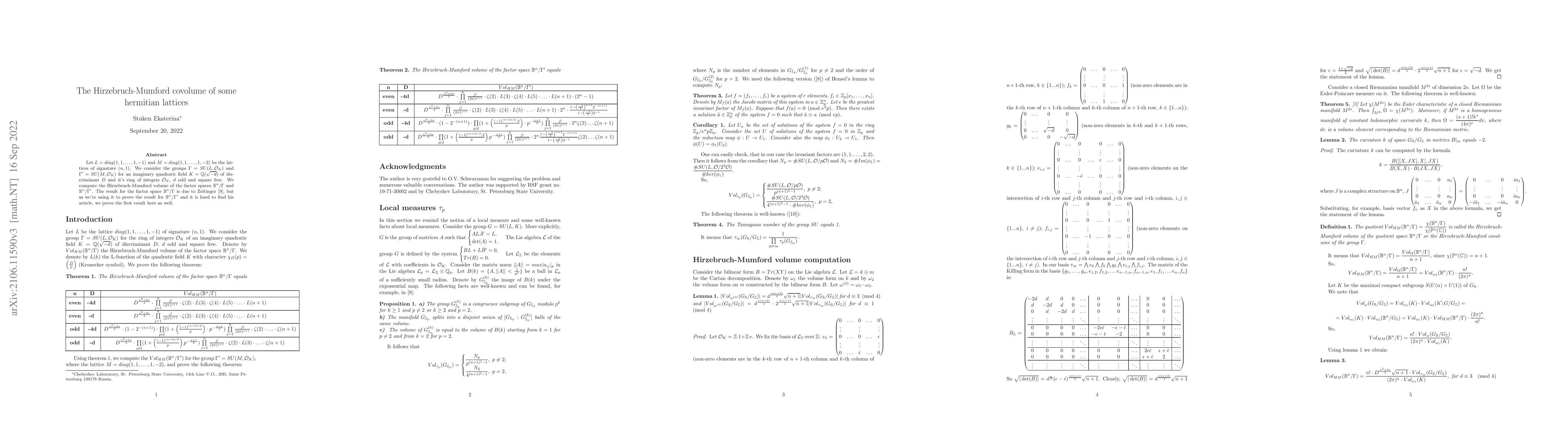 This paper computes the Hirzebruch-Mumford covolume for two specific hermitian lattices, $\Gamma=SU(L,\mathcal{O}_K)$ and $\Gamma'=SU(M,\mathcal{O}_K)$, where $L$ and $M$ have signature $(n,1)$ and $K$ is an imaginary quadratic field. The authors provide a detailed proof for $\mathbb{B}^n/\Gamma$ and extend the result to $\mathbb{B}^n/\Gamma'$.
