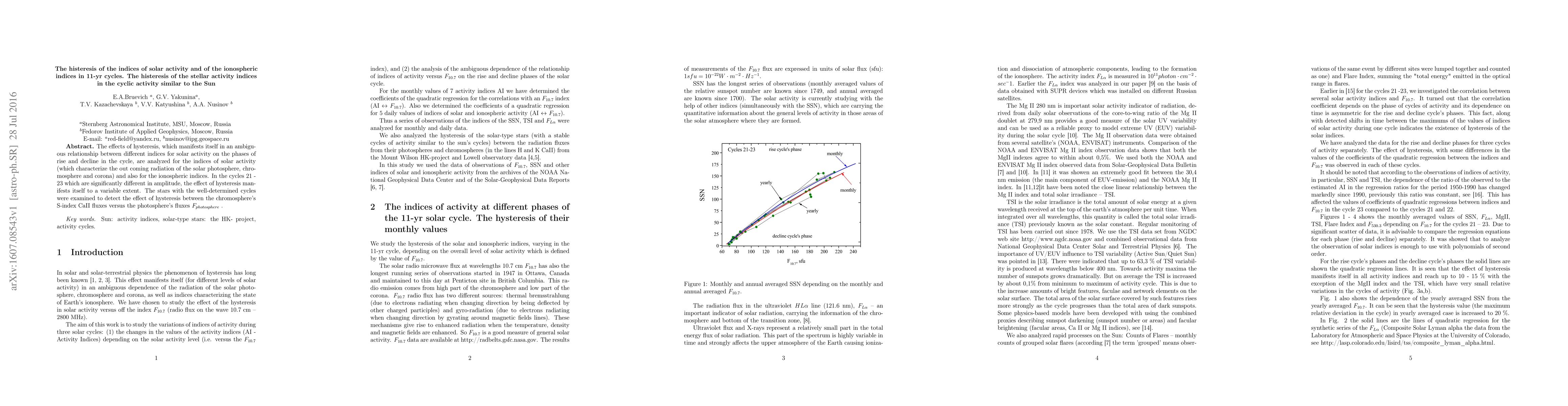The analysis of the effect of the hysteresis, which manifests itself in an ambiguous relationship of radiation from the photosphere, chromosphere and corona on the rise and decline phases of the solar and stellar activity cycles have done. Some indices of solar activity: the flux of the hydrogen Lyman-alpha emission, the 10.7 cm flux, the sunspot number SSN, the flux in the coronal green line 530.3 nm, the solar constant TSI and the 280 nm Mg II flux were studied. The stars with the well-determined cycles were examined to detect the effect of hysteresis between the chromosphere's S-index CaII fluxes versus the photosphere's fluxes Fphotosphere.