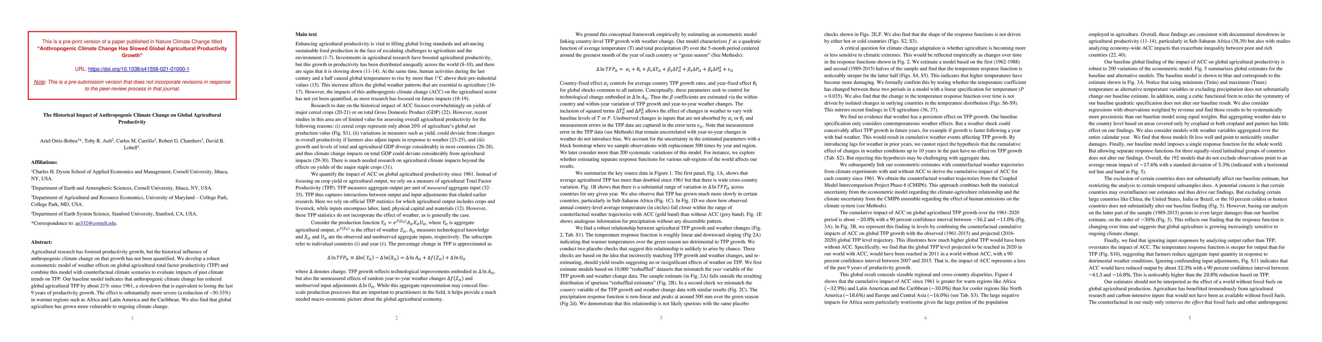 This paper quantifies the impact of anthropogenic climate change on global agricultural productivity, finding a 21% reduction in total factor productivity since 1961, equivalent to a loss of 9 years of growth. The effect is more pronounced in warmer regions, where productivity declines are estimated at 30-33%.
