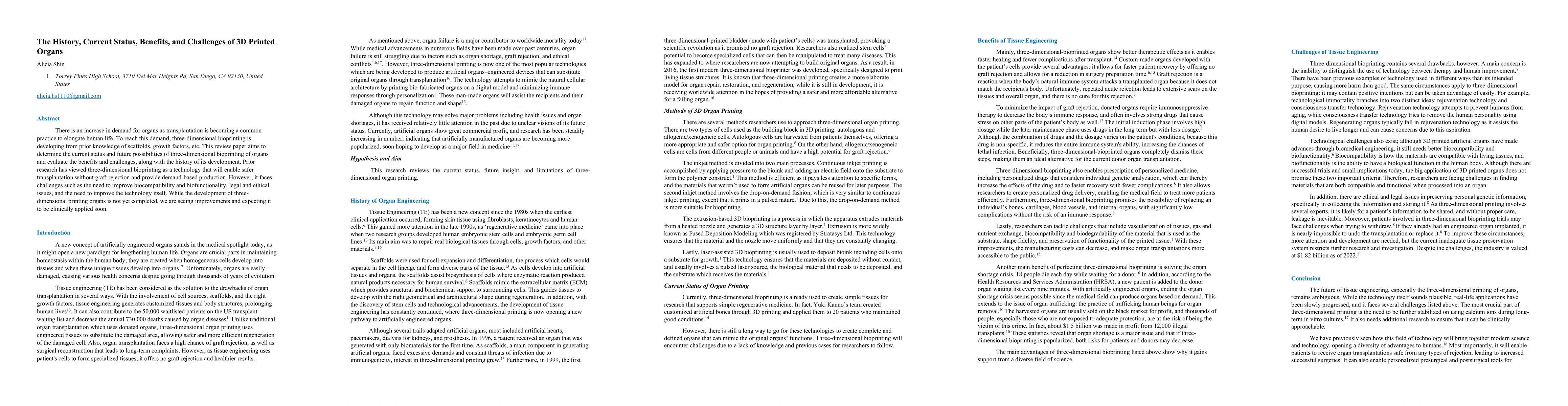 This paper reviews the history, current status, and future potential of 3D printed organs, highlighting their benefits and challenges. Despite promising advancements in biocompatibility and functionality, issues like legal, ethical concerns, and technological improvements remain significant hurdles.