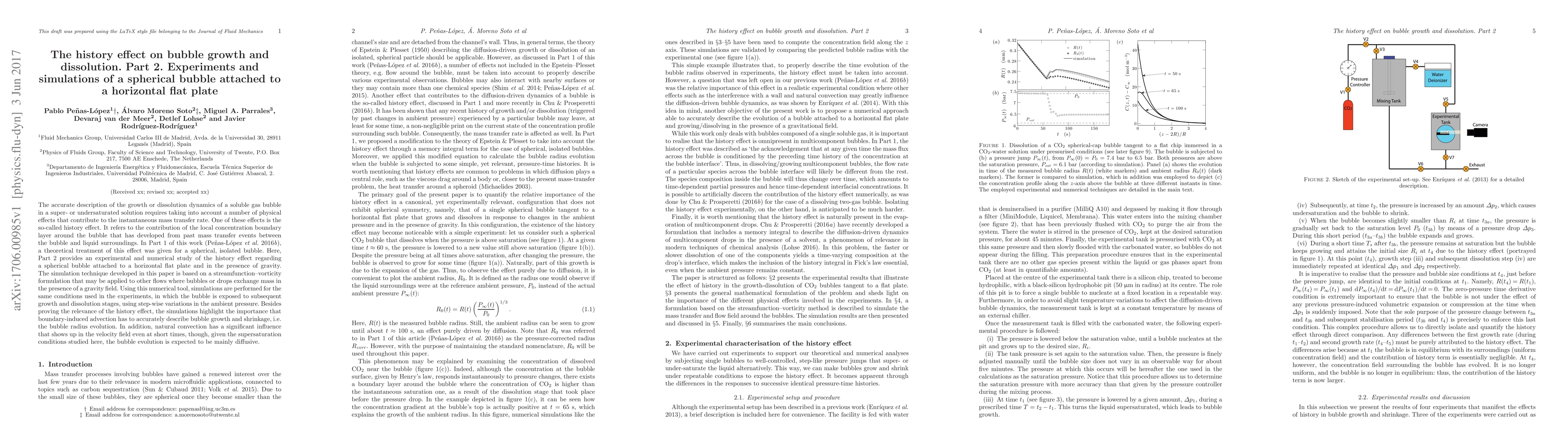 The accurate description of the growth or dissolution dynamics of a soluble gas bubble in a super- or undersaturated solution requires taking into account a number of physical effects that contribute to the instantaneous mass transfer rate. One of these effects is the so-called history effect. It refers to the contribution of the local concentration boundary layer around the bubble that has developed from past mass transfer events between the bubble and liquid surroundings. In Part 1 of this work \citep{penas2016}, a theoretical treatment of this effect was given for a spherical, isolated bubble. Here, Part 2 provides an experimental and numerical study of the history effect regarding a spherical bubble attached to a horizontal flat plate and in the presence of gravity. The simulation technique developed in this paper is based on a streamfunction--vorticity formulation that may be applied to other flows where bubbles or drops exchange mass in the presence of a gravity field. Using this numerical tool, simulations are performed for the same conditions used in the experiments, in which the bubble is exposed to subsequent growth and dissolution stages, using step-wise variations in the ambient pressure. Besides proving the relevance of the history effect, the simulations highlight the importance that boundary-induced advection has to accurately describe bubble growth and shrinkage, i.e. the bubble radius evolution. In addition, natural convection has a significant influence that shows up in the velocity field even at short times, though, given the supersaturation conditions studied here, the bubble evolution is expected to be mainly diffusive.