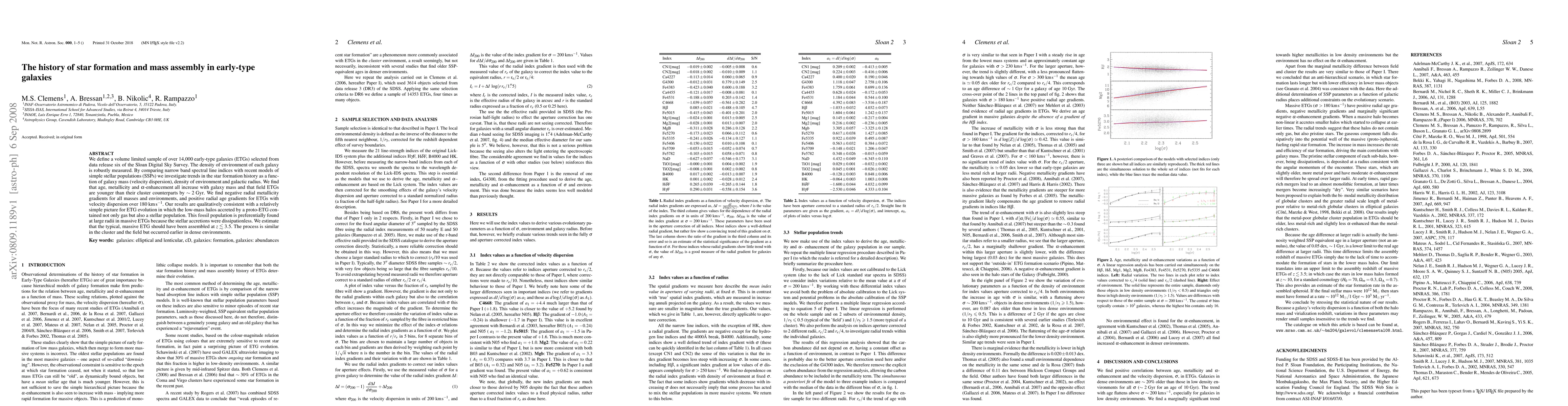 This study examines the star formation history and mass assembly of early-type galaxies (ETGs) using a sample of over 14,000 galaxies from the Sloan Digital Sky Survey. It finds that age, metallicity, and alpha-enhancement increase with galaxy mass, and that field ETGs are younger than cluster ETGs by ~2 Gyr, suggesting a relatively simple evolution model where low-mass halos accreted both gas and stellar populations.