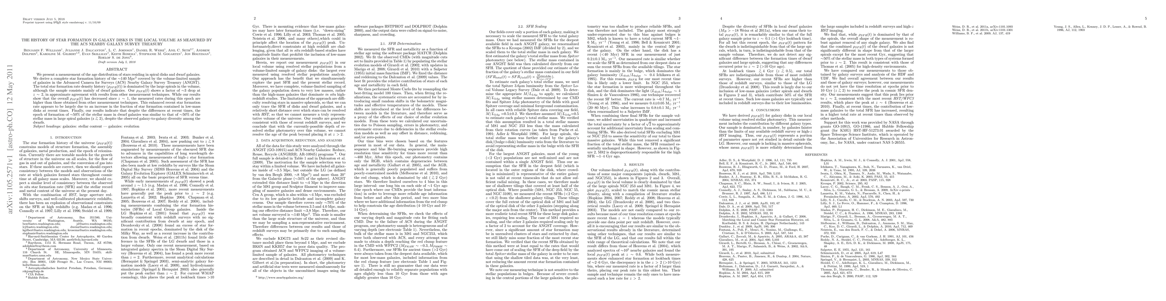 We present a measurement of the age distribution of stars residing in spiral disks and dwarf galaxies. We derive a complete star formation history of the ~140 Mpc^3 covered by the volume-limited sample of galaxies in the Advanced Camera for Surveys (ACS) Nearby Galaxy Survey Treasury (ANGST). The total star formation rate density history is dominated by the large spirals in the volume, although the sample consists mainly of dwarf galaxies. Our measurement shows a factor of ~3 drop at z~2, in approximate agreement with results from other measurement techniques. While our results show that the overall star formation rate density has decreased since z~1, the measured rates during this epoch are higher than those obtained from other measurement techniques. This enhanced recent star formation rate appears to be largely due to an increase in the fraction of star formation contained in low-mass disks at recent times. Finally, our results indicate that despite the differences at recent times, the epoch of formation of ~50% of the stellar mass in dwarf galaxies was similar to that of ~50% of the stellar mass in large spiral galaxies (z>~2), despite the observed galaxy-to-galaxy diversity among the dwarfs.