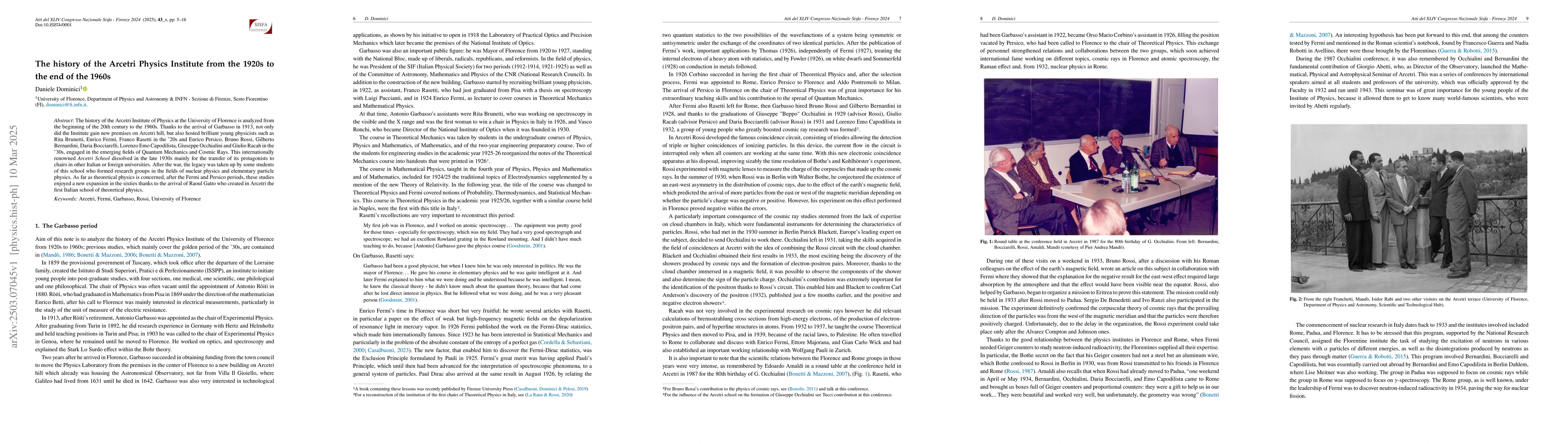This research highlights the crucial role of the Arcetri Physics Institute in shaping modern physics, nurturing renowned physicists, and fostering groundbreaking research in various fields, including quantum mechanics, cosmic rays, nuclear physics, and theoretical physics.
