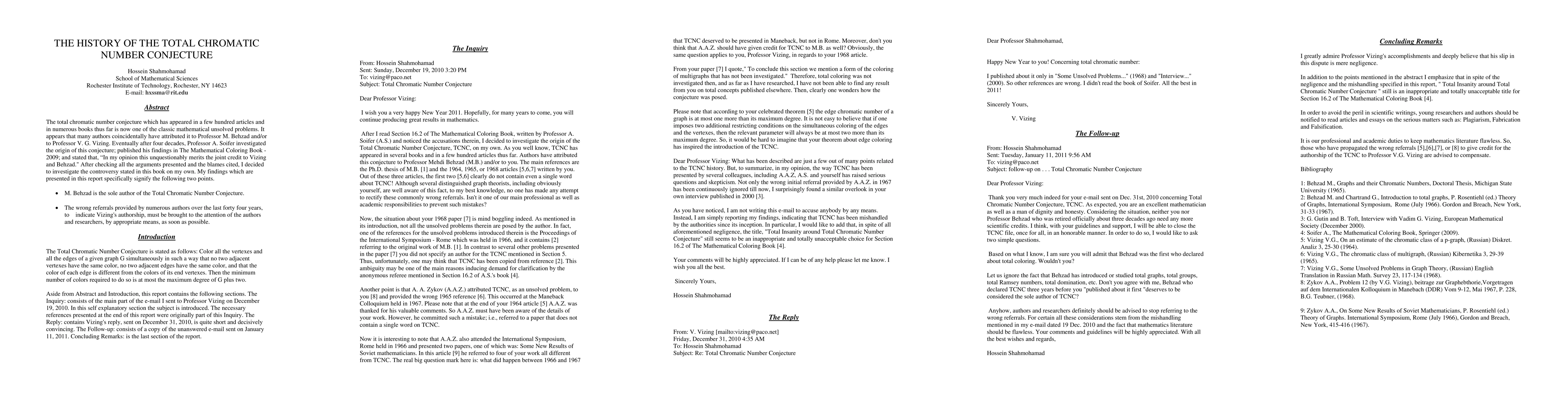 The total chromatic number conjecture which has appeared in a few hundred articles and in numerous books thus far is now one of the classic mathematical unsolved problems. It appears that many authors coincidentally have attributed it to Professor M. Behzad and/or to Professor V. G. Vizing. Eventually after four decades, Professor A. Soifer investigated the origin of this conjecture; published his findings in The Mathematical Coloring Book - 2009; and stated that, "In my opinion this unquestionably merits the joint credit to Vizing and Behzad." After checking all the arguments presented and the blames cited, I decided to investigate the controversy stated in this book on my own. My findings which are presented in this report specifically signify the following two points. - M. Behzad is the sole author of the Total Chromatic Number Conjecture. - The wrong referrals provided by numerous authors over the last forty four years, to indicate Vizing's authorship, must be brought to the attention of the authors and researchers, by appropriate means, as soon as possible.