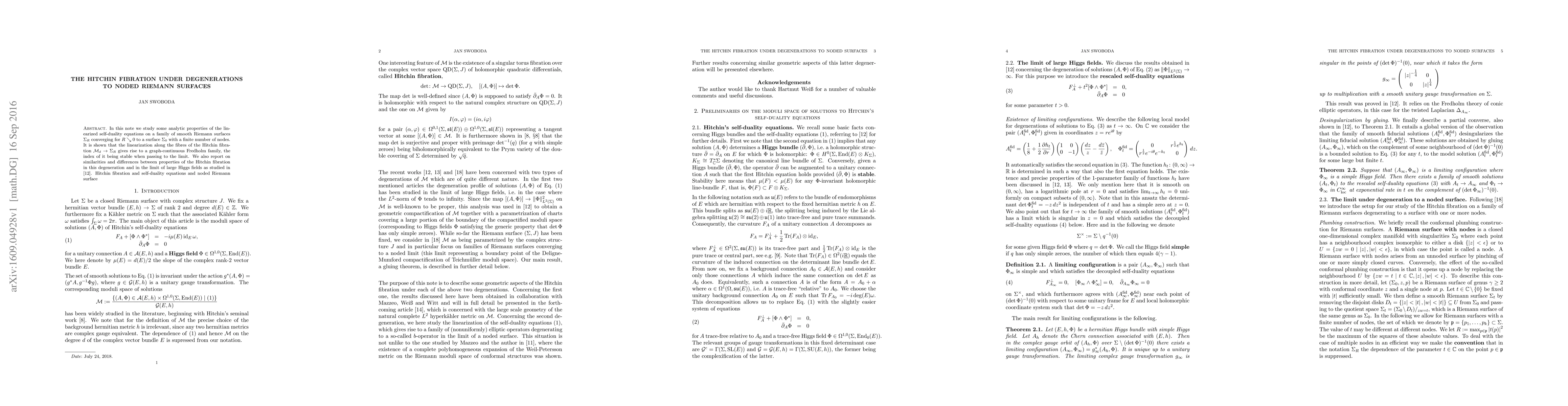 In this note we study some analytic properties of the linearized self-duality equations on a family of smooth Riemann surfaces $\Sigma_R$ converging for $R\searrow0$ to a surface $\Sigma_0$ with a finite number of nodes. It is shown that the linearization along the fibres of the Hitchin fibration gives rise to a graph-continuous Fredholm family, the index of it being stable when passing to the limit. We also report on similarities and differences between properties of the Hitchin fibration in this degeneration and in the limit of large Higgs fields.