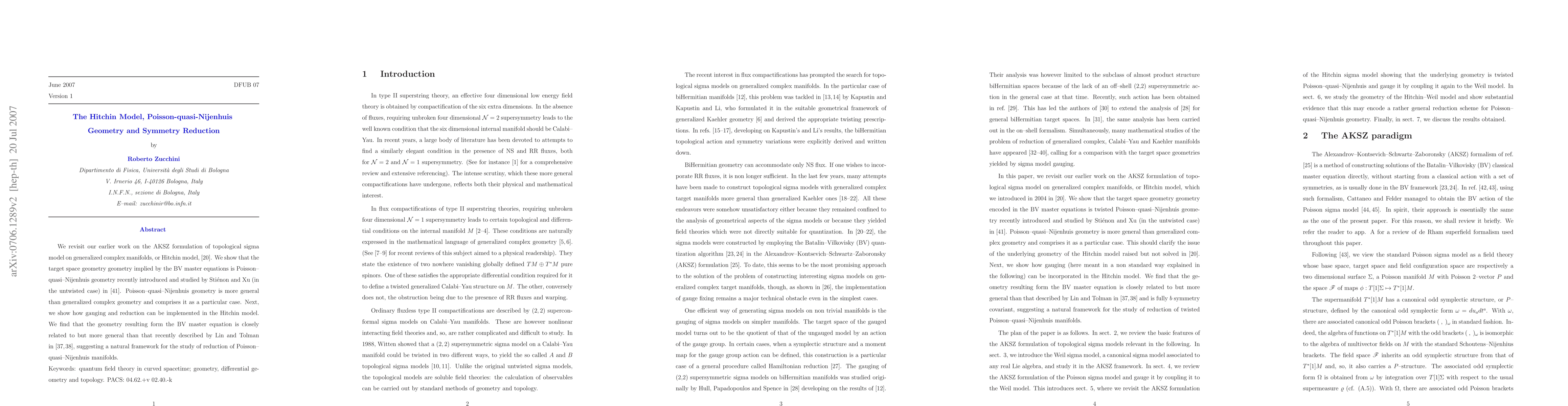 We revisit our earlier work on the AKSZ formulation of topological sigma model on generalized complex manifolds, or Hitchin model. We show that the target space geometry geometry implied by the BV master equations is Poisson--quasi--Nijenhuis geometry recently introduced and studied by Sti\'enon and Xu (in the untwisted case). Poisson--quasi--Nijenhuis geometry is more general than generalized complex geometry and comprises it as a particular case. Next, we show how gauging and reduction can be implemented in the Hitchin model. We find that the geometry resulting form the BV master equation is closely related to but more general than that recently described by Lin and Tolman, suggesting a natural framework for the study of reduction of Poisson--quasi--Nijenhuis manifolds.