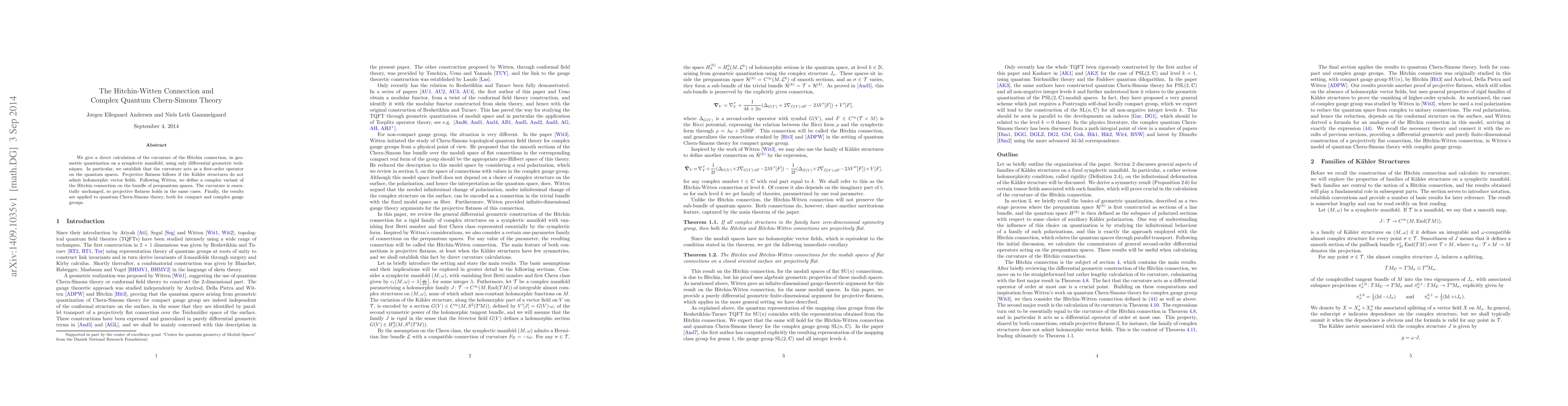 We give a direct calculation of the curvature of the Hitchin connection, in geometric quantization on a symplectic manifold, using only differential geometric techniques. In particular, we establish that the curvature acts as a first-order operator on the quantum spaces. Projective flatness follows if the K\"ahler structures do not admit holomorphic vector fields. Following Witten, we define a complex variant of the Hitchin connection on the bundle of prequantum spaces. The curvature is essentially unchanged, so projective flatness holds in the same cases. Finally, the results are applied to quantum Chern-Simons theory, both for compact and complex gauge groups.